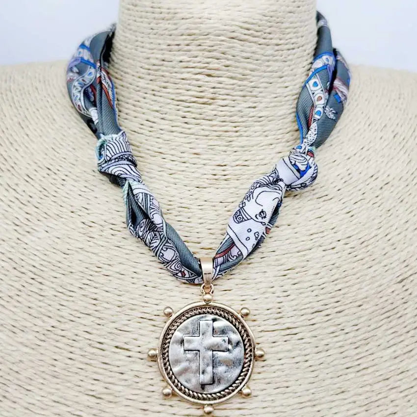 Knotted Scarf Necklace with Cross Coin