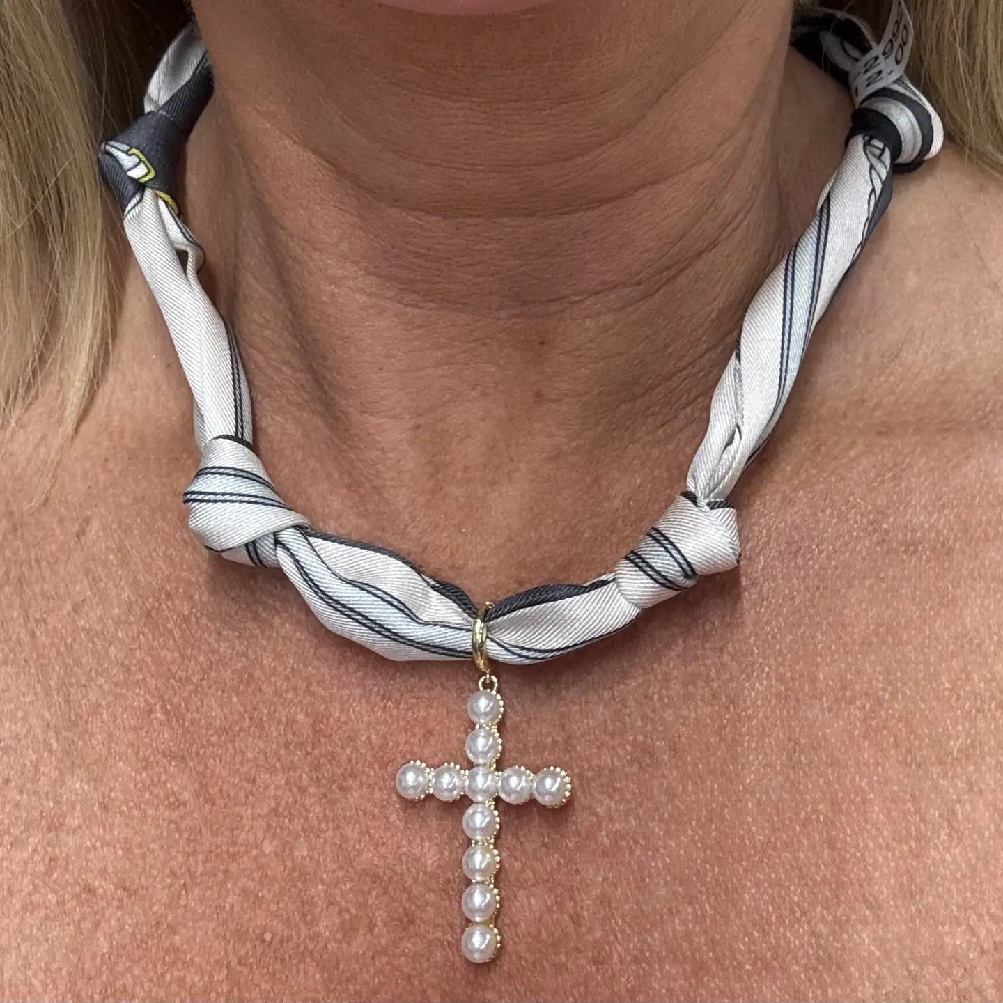 Knotted Scarf Grey and White with Pearl Bubble cross