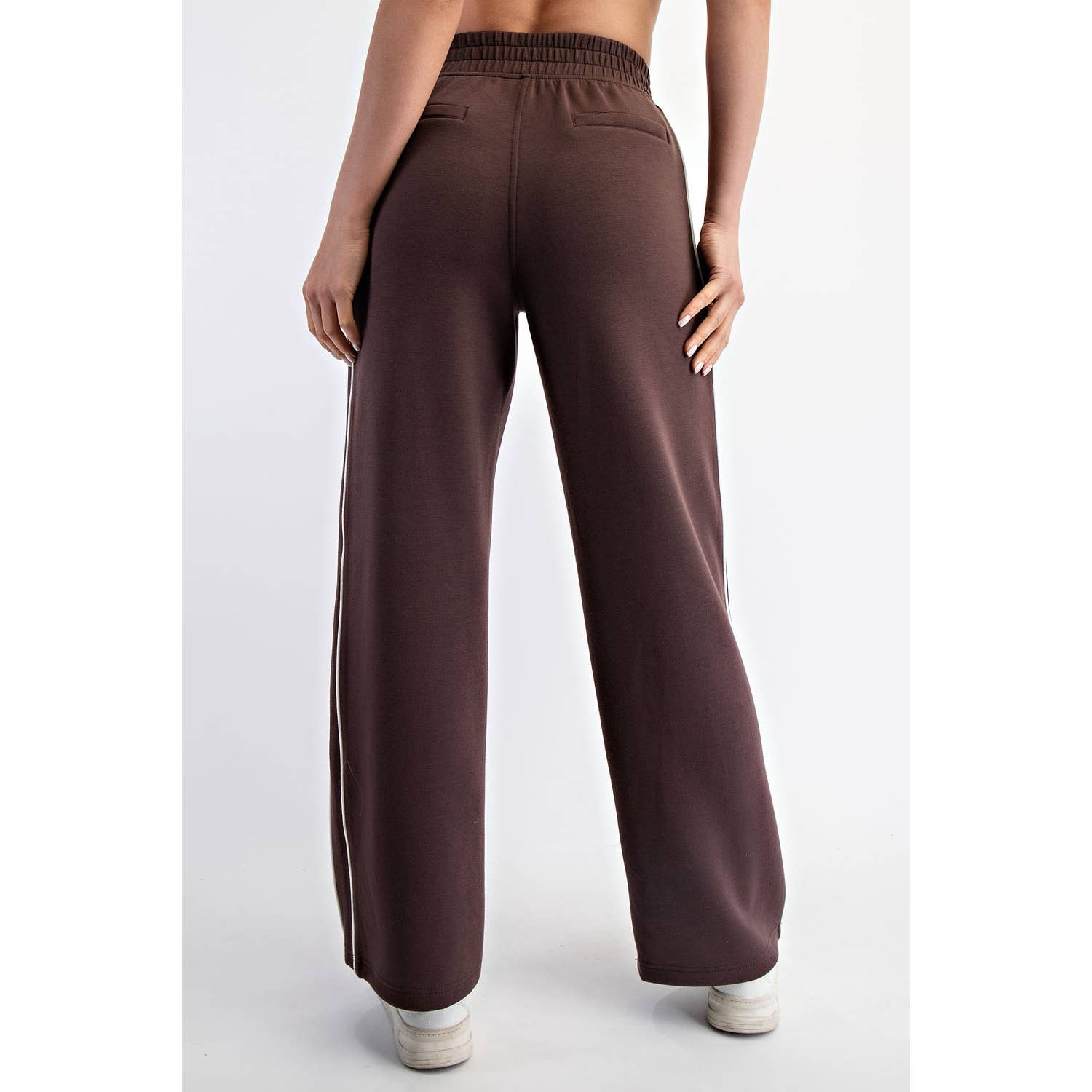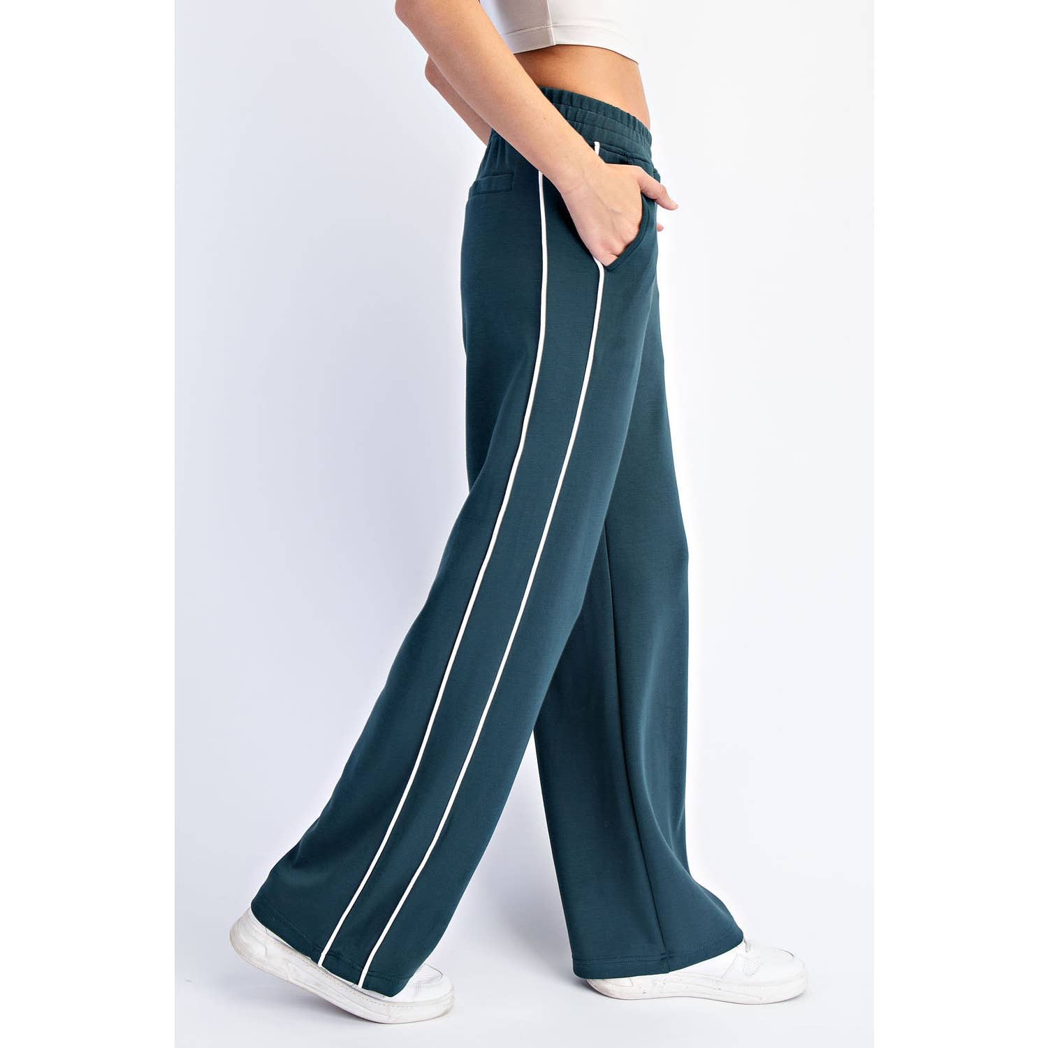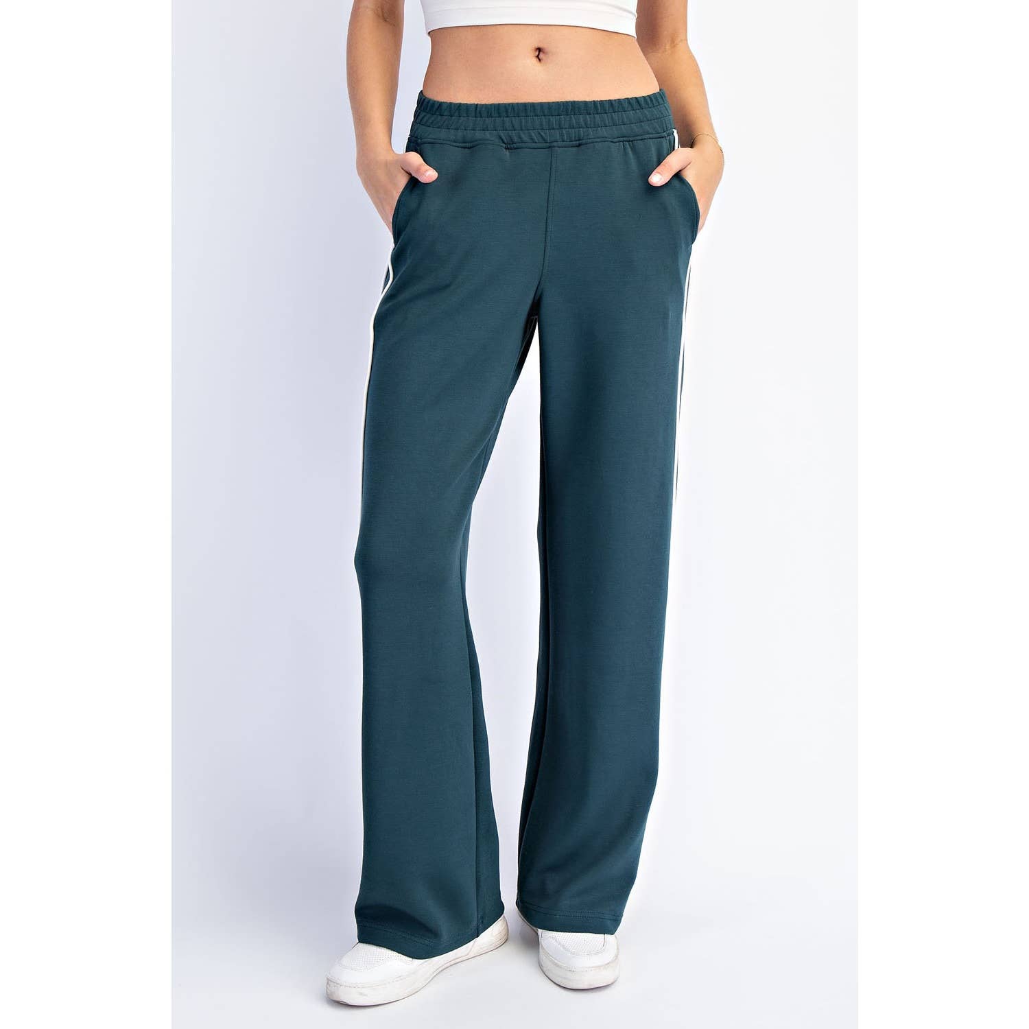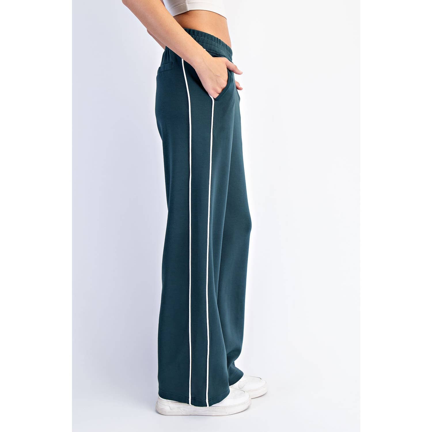 Effortlessly elevated, these full-length pants are crafted from luxurious, silky smooth and lightweight fabric. Designed with a relaxed fit and 4-way stretch for all-day comfort, they feature a back faux pocket and double piping details for a sleek, modern touch. Features: - Modal poly span scuba fabric - Silky smooth and lightweight - 4-way stretch - Relaxed fit - Full length - Elastic waistband - Side pockets - Back faux pocket - Double-stripe piping details Fabric: 48% Modal, 45% Polyester, 7% Spandex