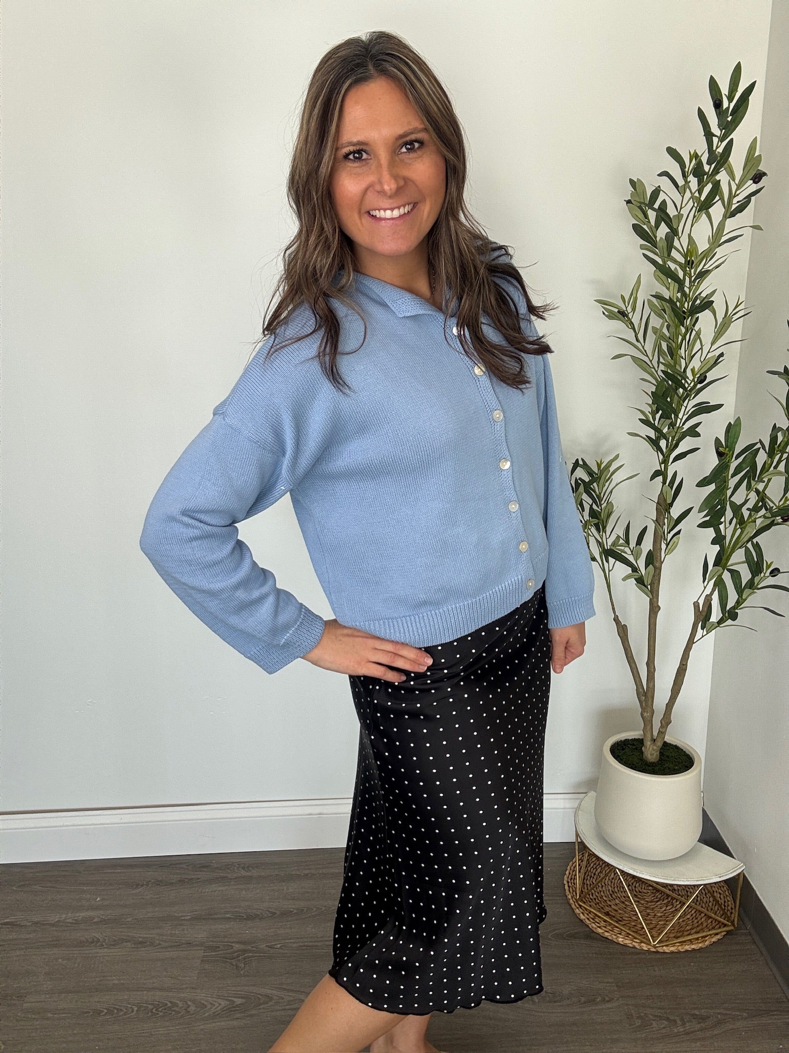 A softly draped bias-cut midi skirt featuring a timeless micro dot print. Designed to skim the body with an effortless, feminine silhouette, this skirt offers beautiful movement and a flattering fit. The elastic waist with delicate picot trim adds a touch of charm while ensuring all-day comfort.