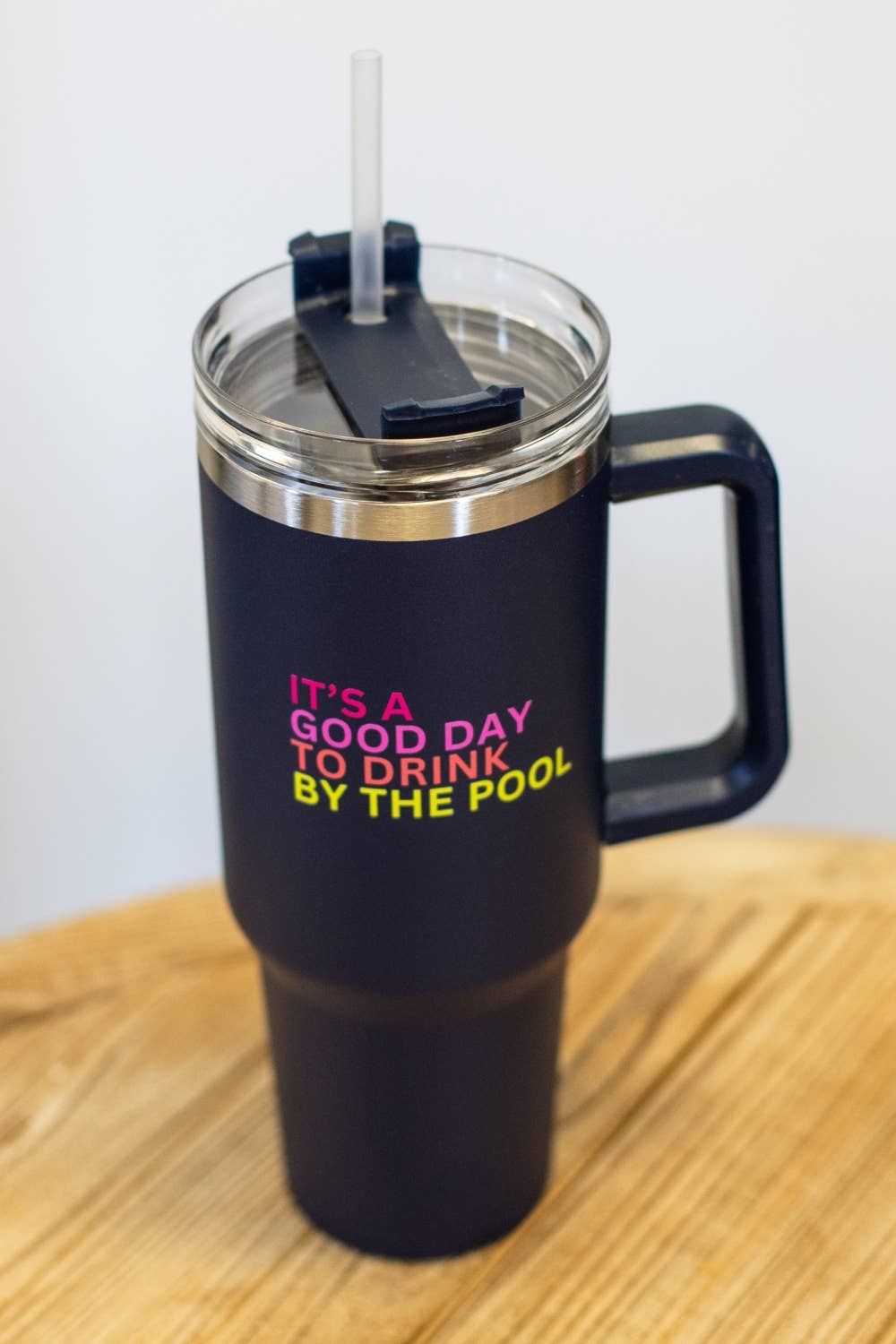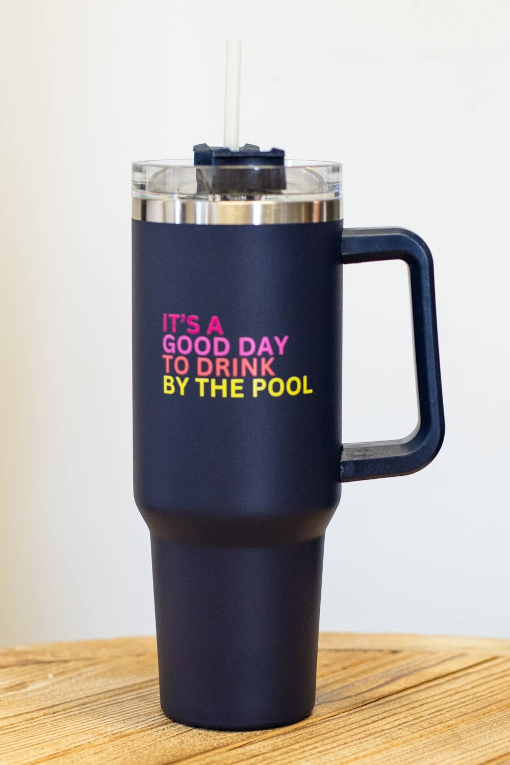 Navy tumbler Multicolored "It's a good day to drink by the pool" text 40 oz. Dishwasher safe, for best results hand wash 10.75"H x 4"W
