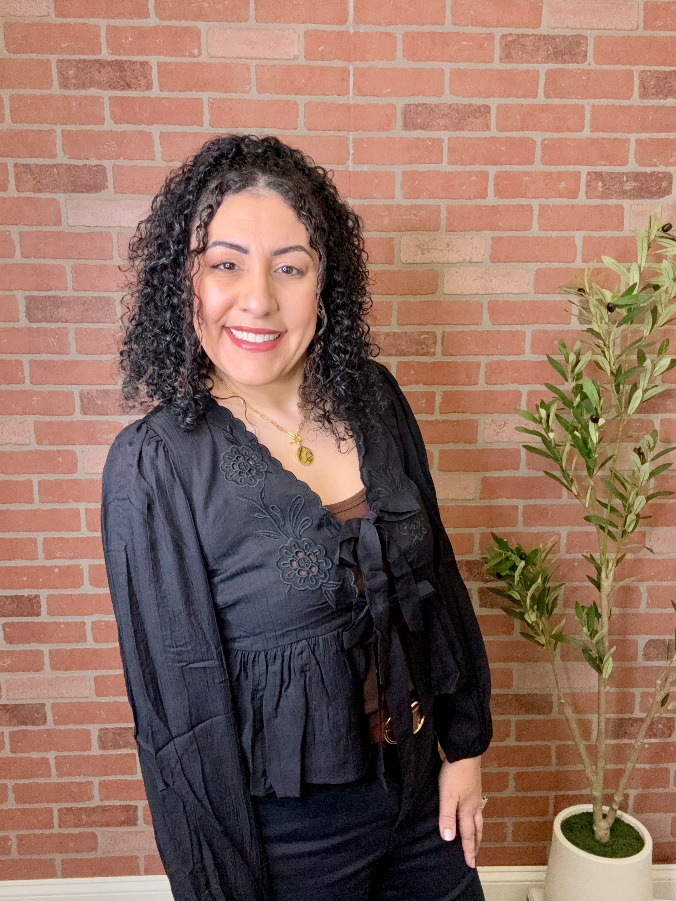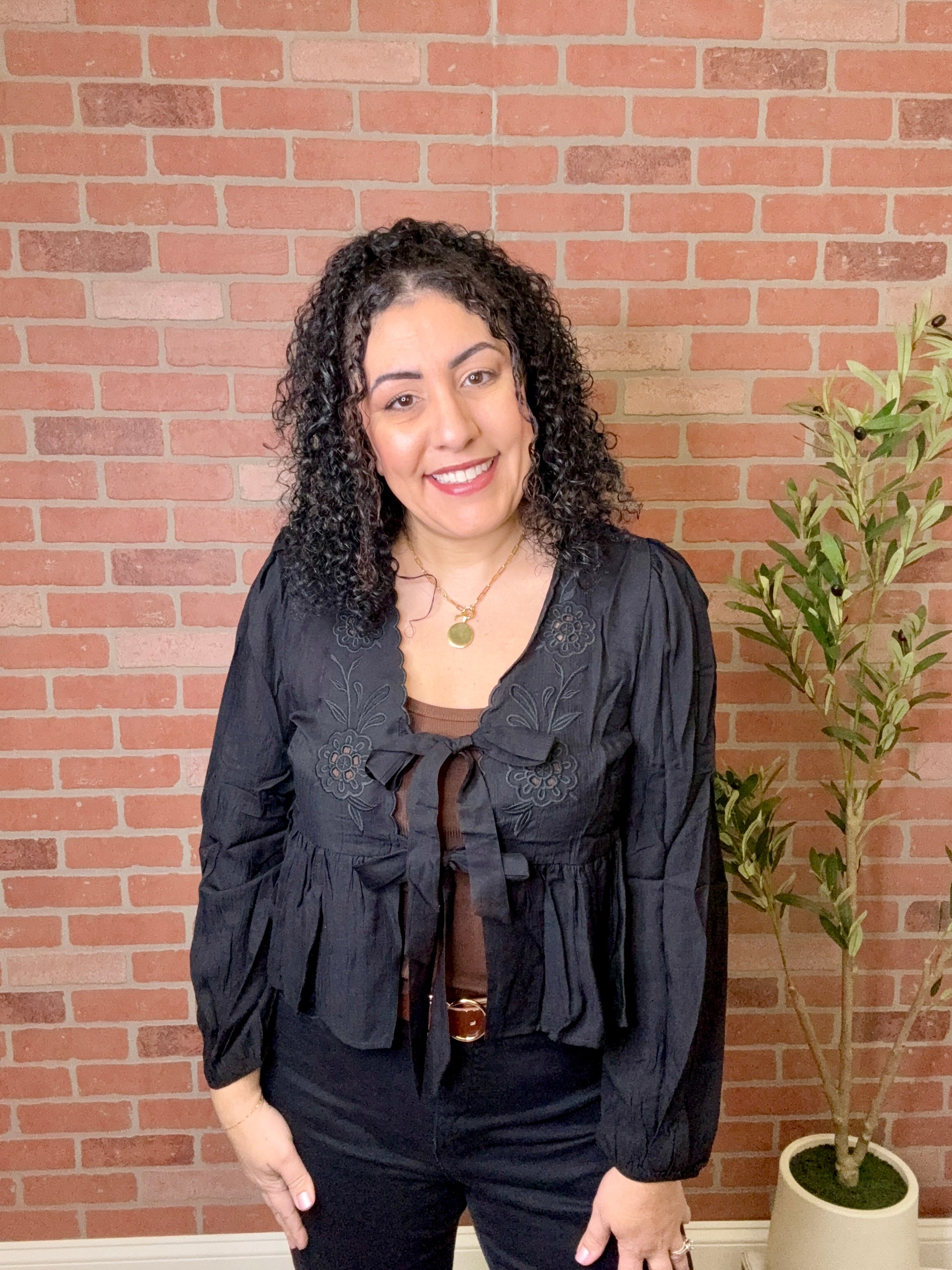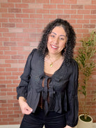 Delicate eyelet detailing meets effortless style in this tie-front top. The adjustable front tie allows you to customize the fit and create a flattering silhouette, while the breathable fabric keeps you comfortable all day. Perfect for layering or wearing solo, this versatile piece transitions seamlessly from casual outings to weekend brunches. A wardrobe essential that works as hard as you do.