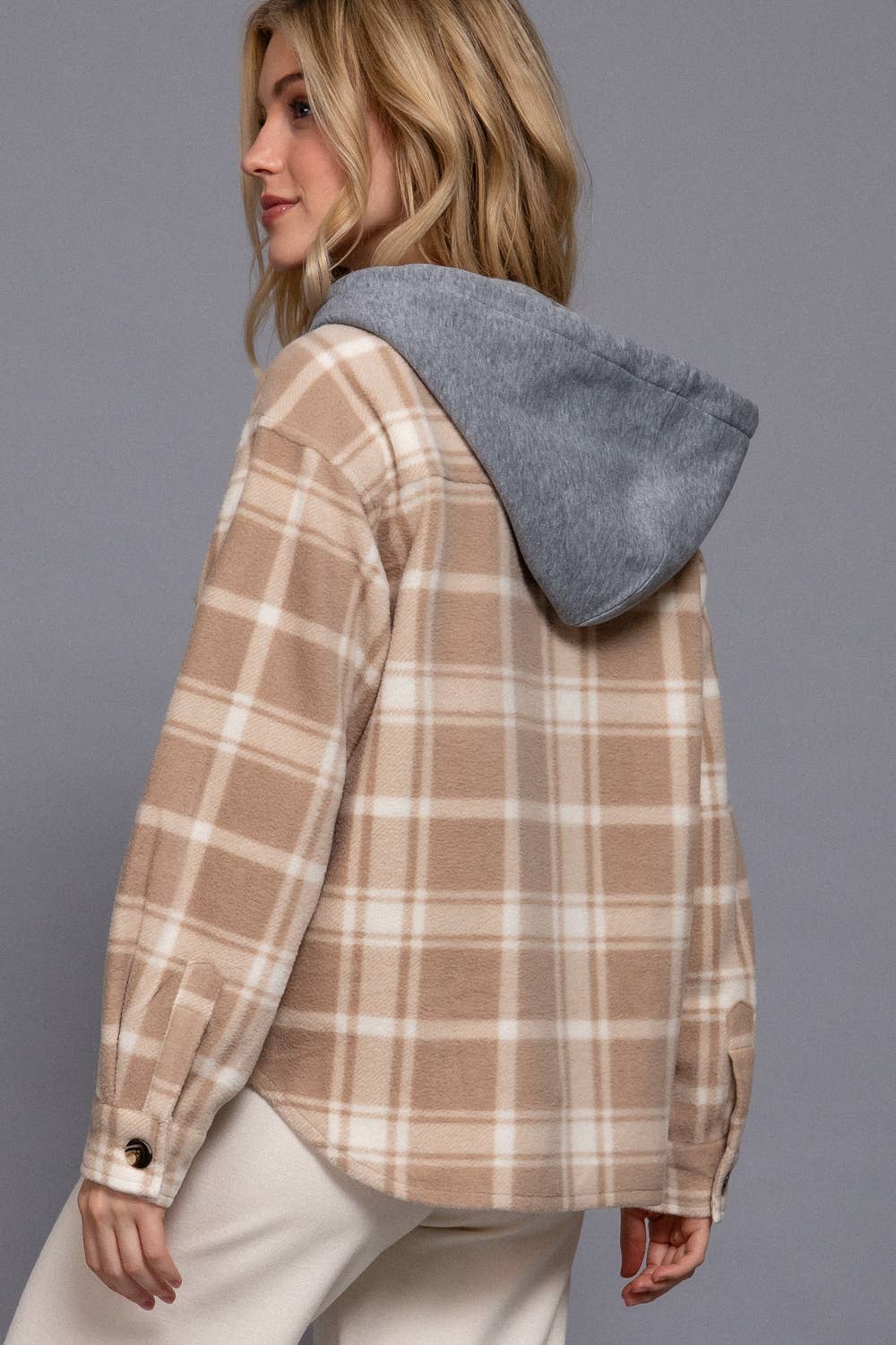 LONG SLEEVE PLAID PRINT BUTTON DOWN WITH HOODIE CASUAL FLEECE JACKET FABRIC: PRINT FLEECE 100% POLYESTER