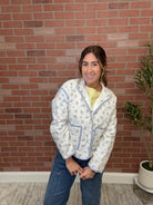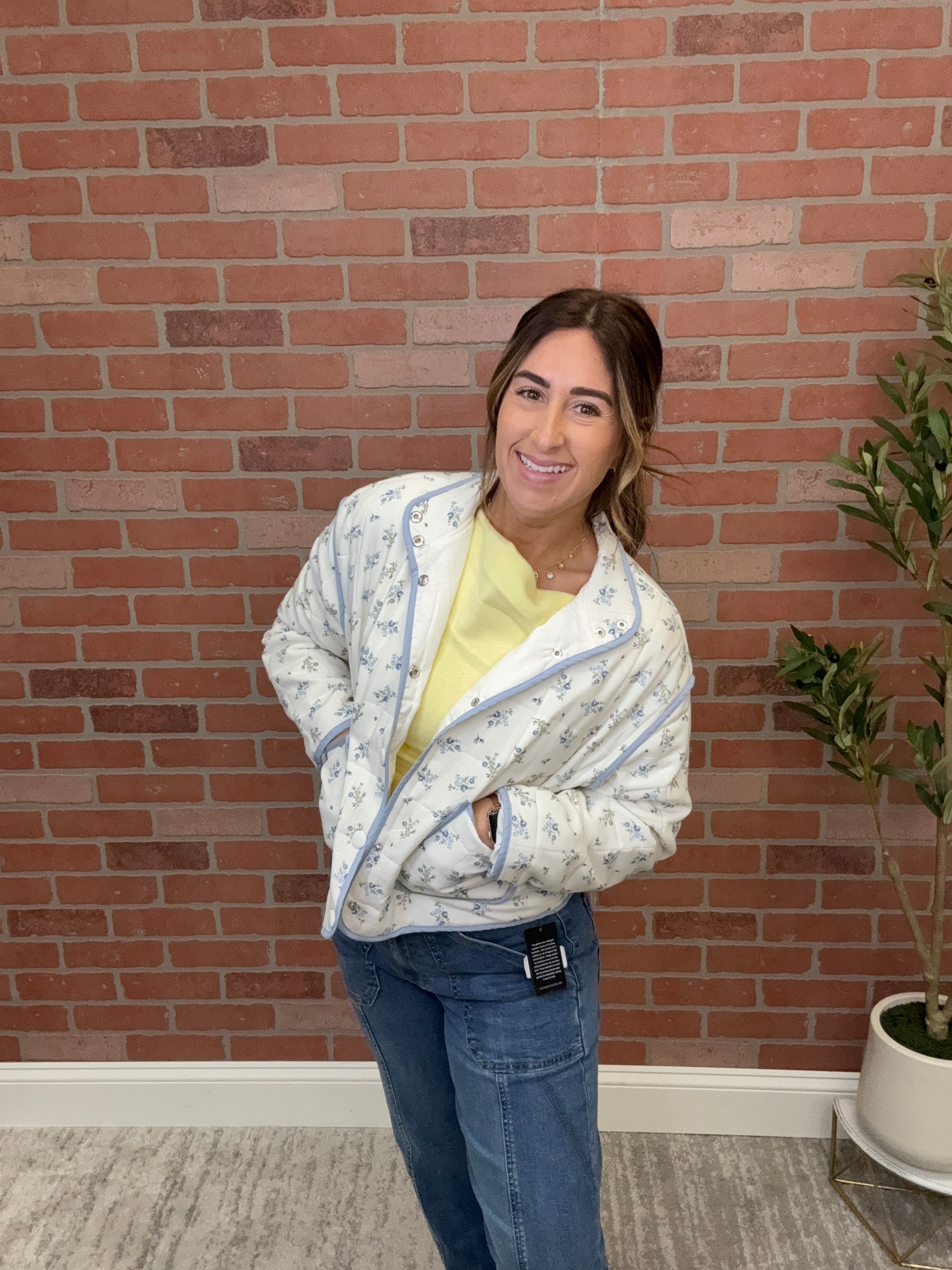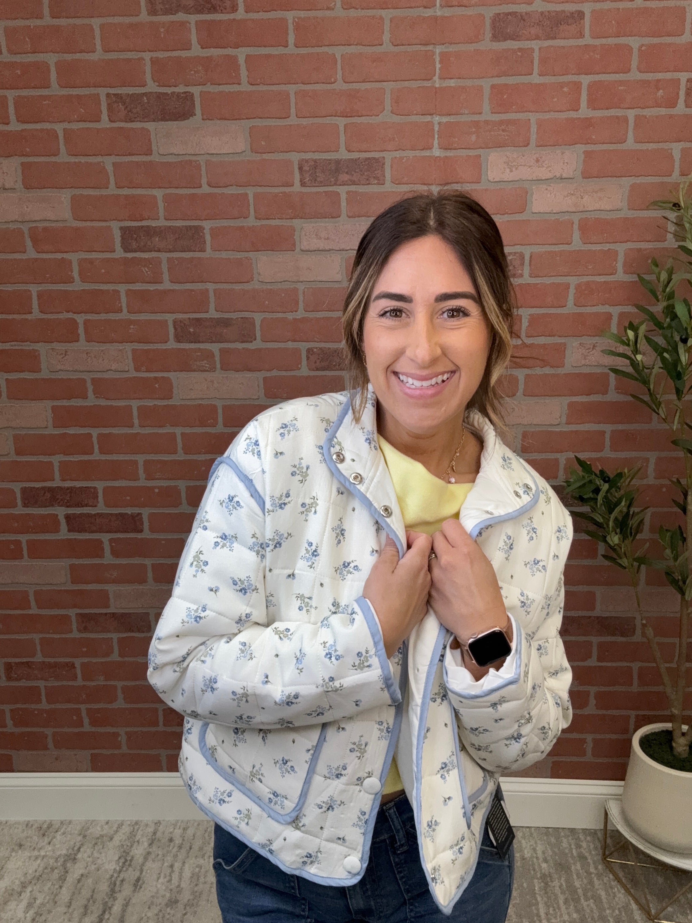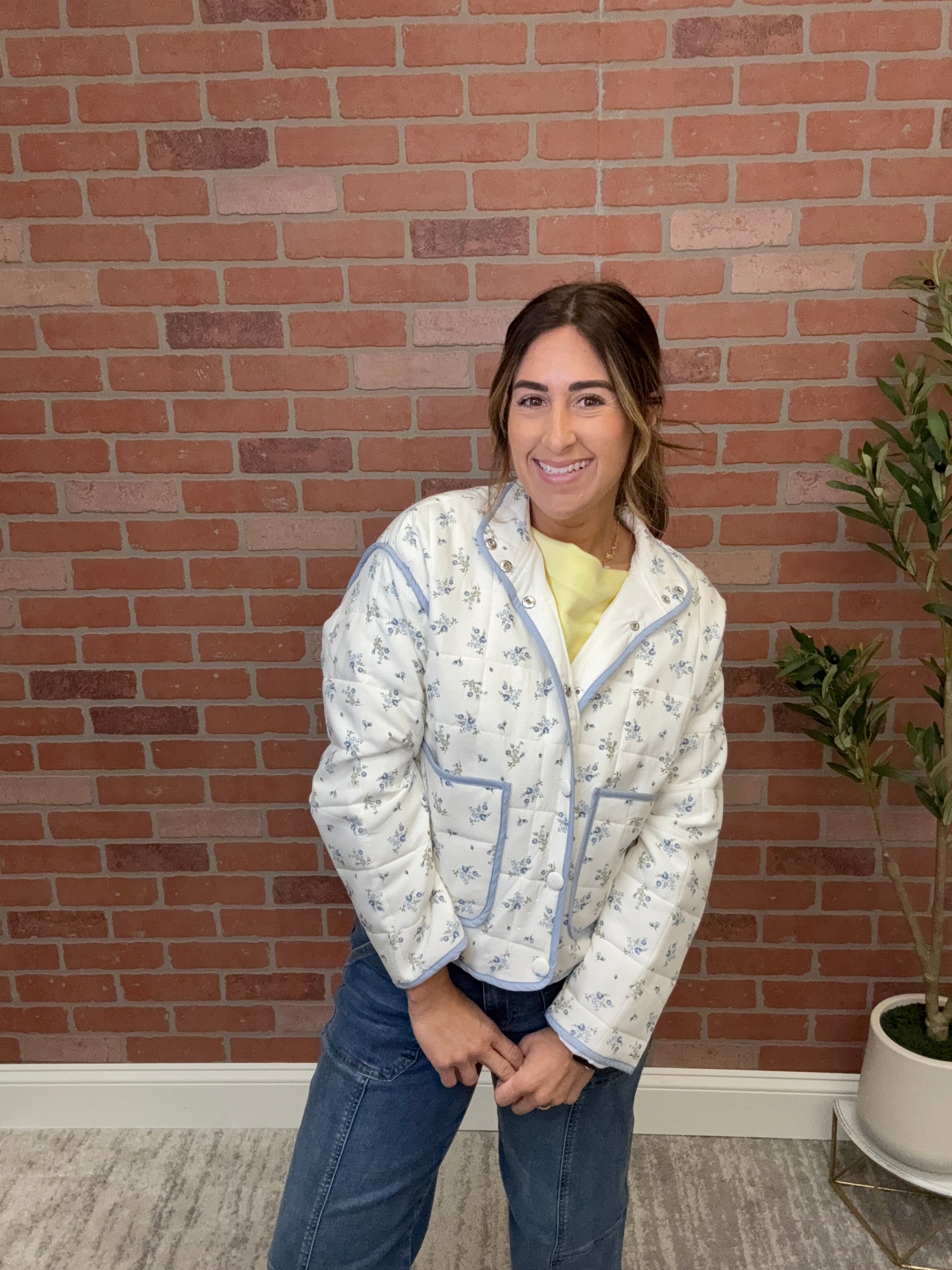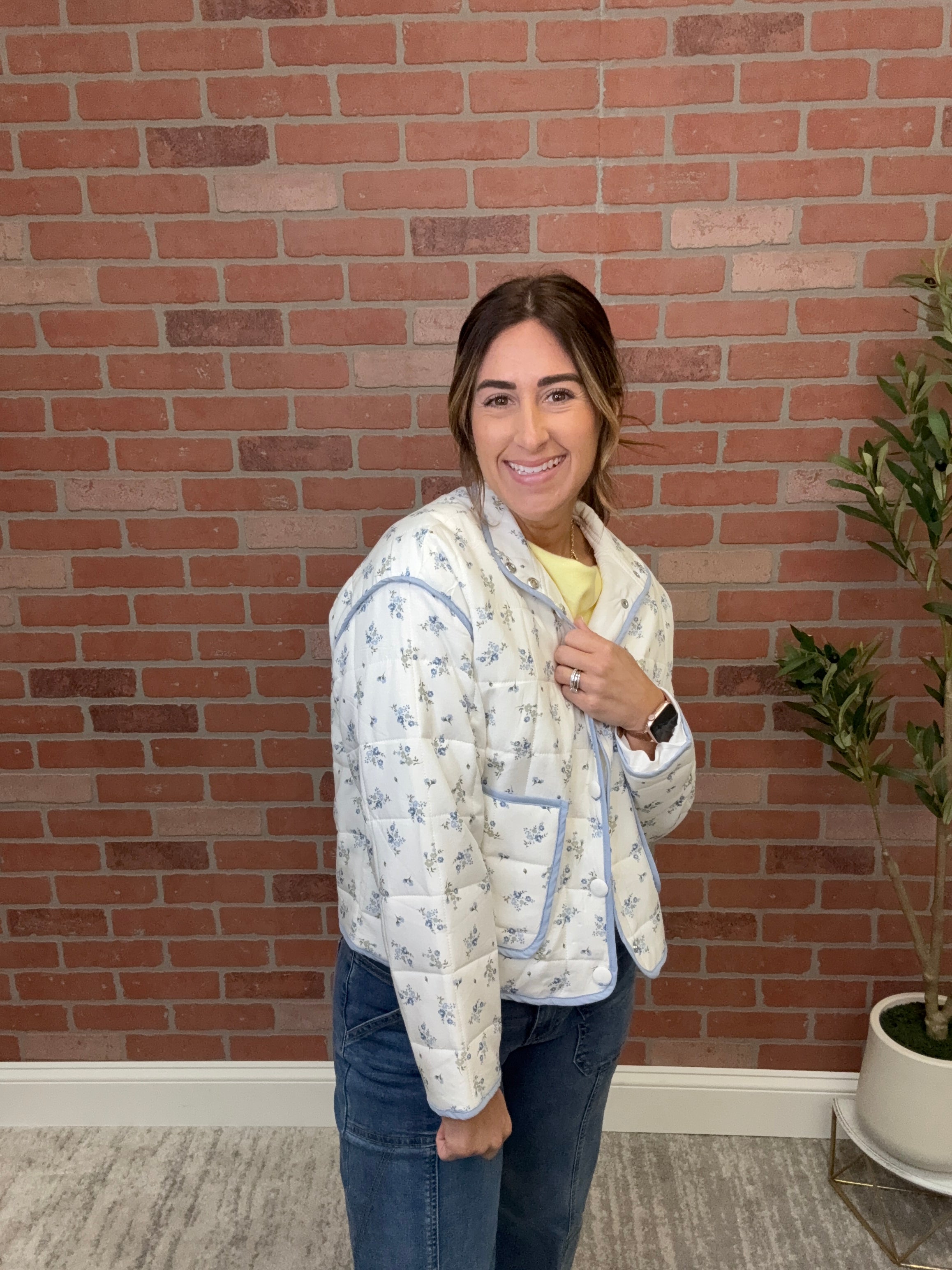 Floral Quilted Jacket This lightweight quilted jacket combines timeless floral detailing with modern construction for effortless layering. The quilted exterior provides subtle structure and warmth without bulk, while the all-over floral print adds visual interest to everyday outfits. Perfect for transitional seasons, it pairs seamlessly with denim, dresses, or casual separates. The tailored fit ensures a polished silhouette, making it equally at home at brunch or running errands.