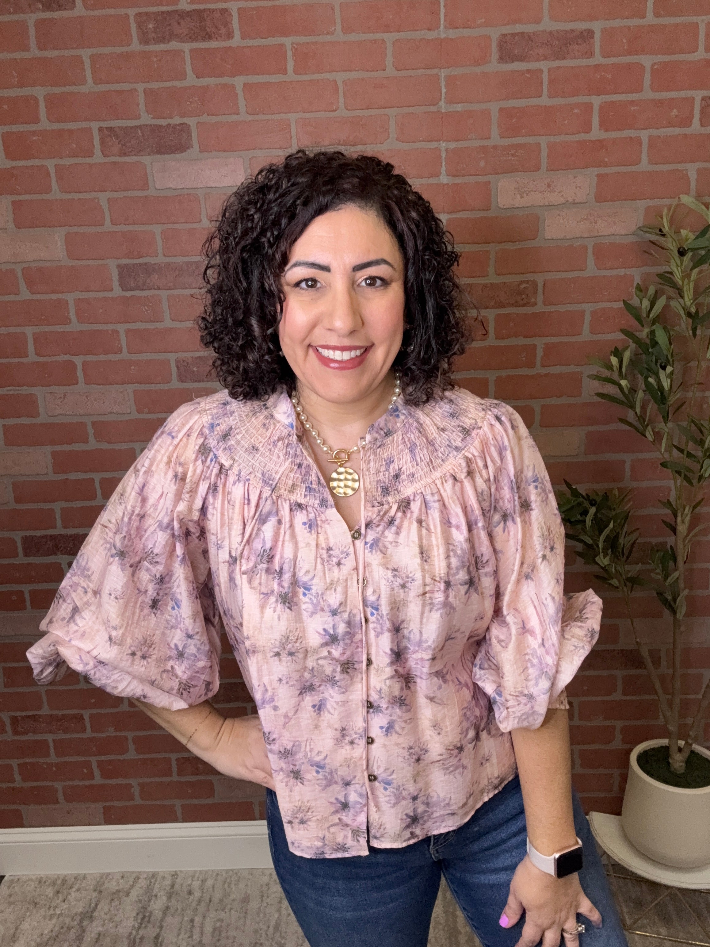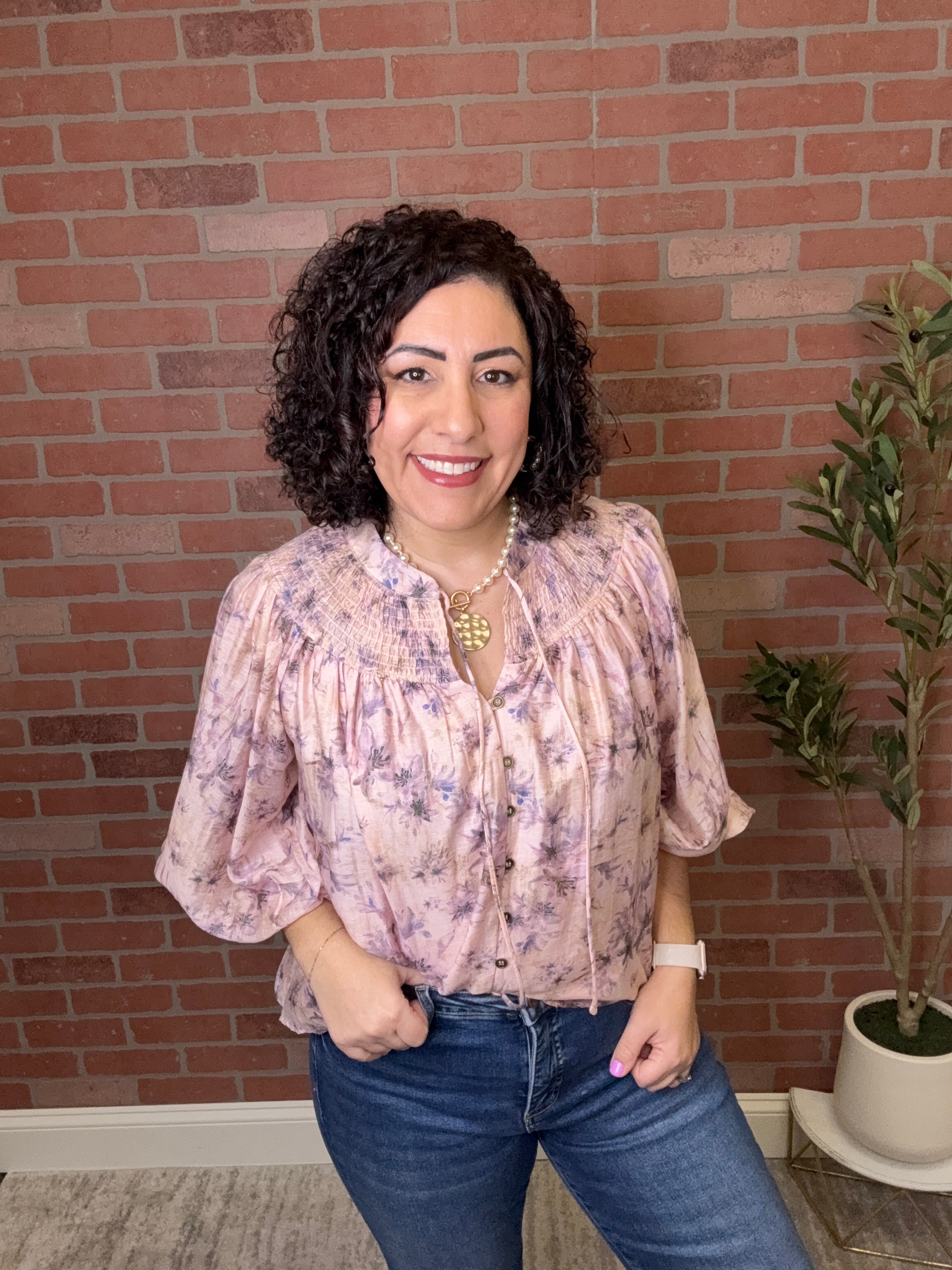 Effortless elegance meets timeless charm with this floral smocked peasant top. Delicate smocking at the bodice creates flattering definition while the relaxed silhouette offers all-day comfort. The romantic floral print brings a fresh, feminine touch perfect for layering or wearing solo. Versatile enough for casual outings or dressed up for weekend gatherings, this piece is a wardrobe essential that transitions seamlessly from season to season.