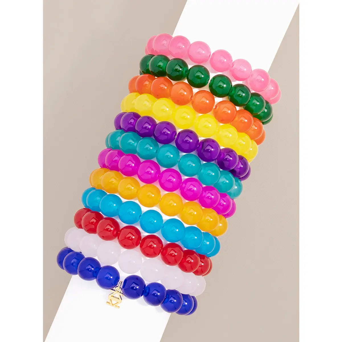 Stretch bracelet composed of glossy lucite glass beads.