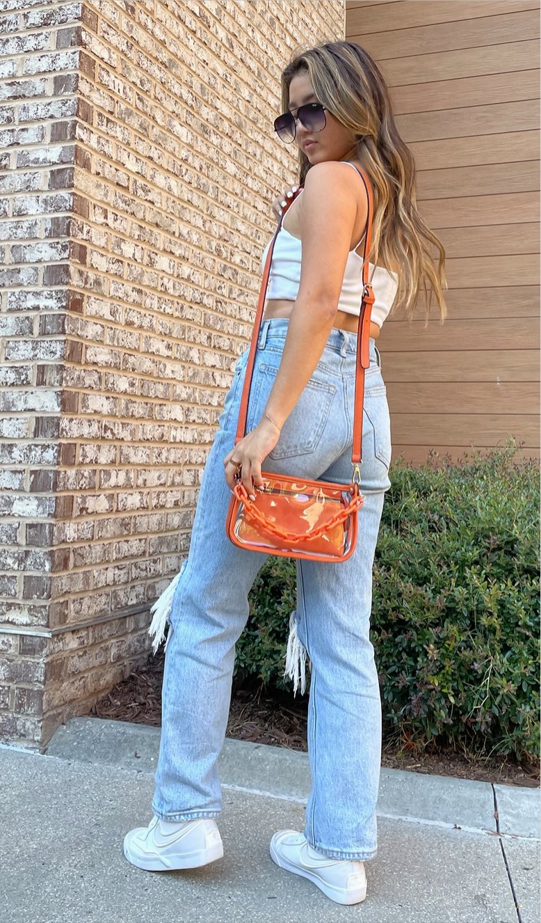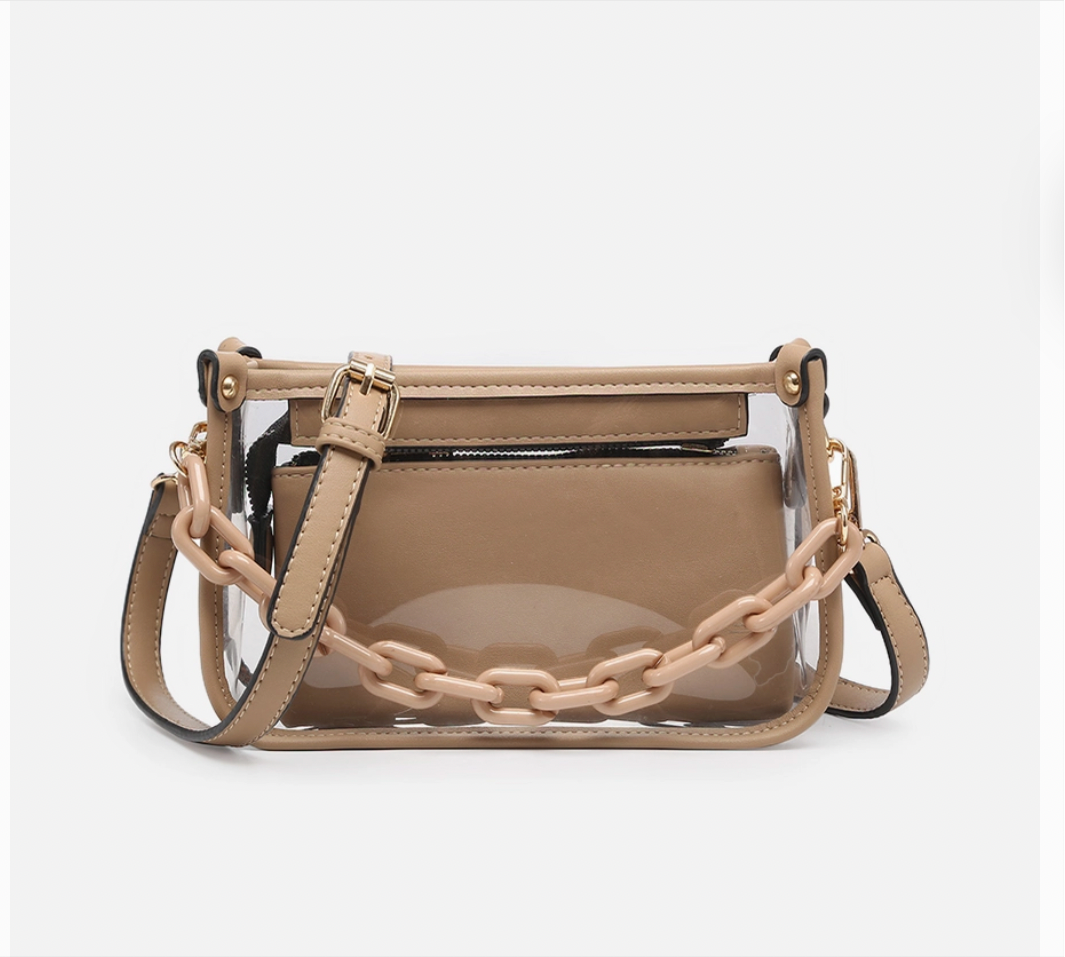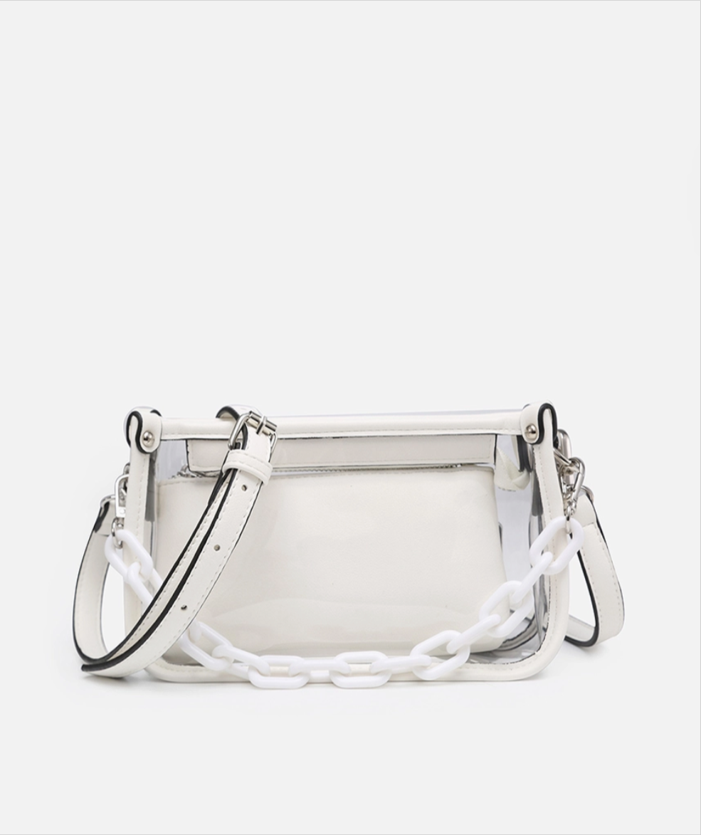 Jessica Clear Crossbody with Chain is a stylish game day essential. Its clear design meets stadium regulations, and the removable chain strap lets you switch between a crossbody or a clutch, offering versatility and modern style for any game day or everyday occasion