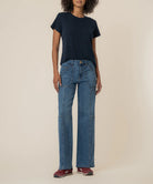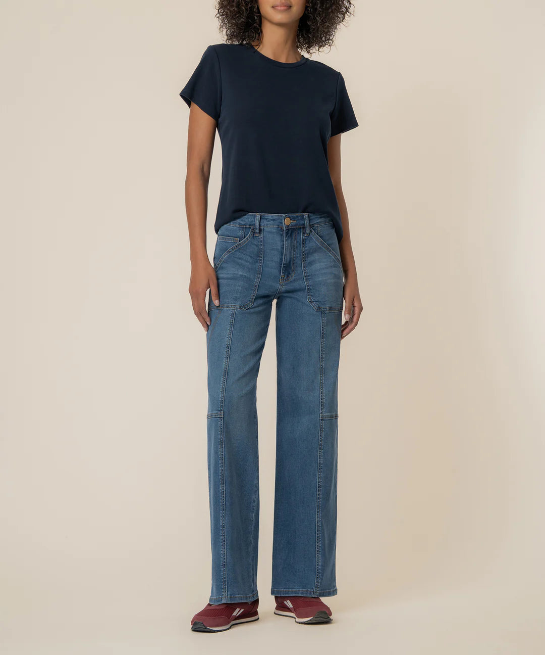 These high-rise, straight-leg jeans are designed in a classic medium wash for a timeless look. Crafted from super stretchy denim, they provide exceptional comfort and ease of movement. Thoughtful panel denim detailing enhances structure and shape, while stylish porkchop pockets add a functional, modern touch. Finished with a straight-leg silhouette, these jeans offer an effortlessly polished style for everyday wear.