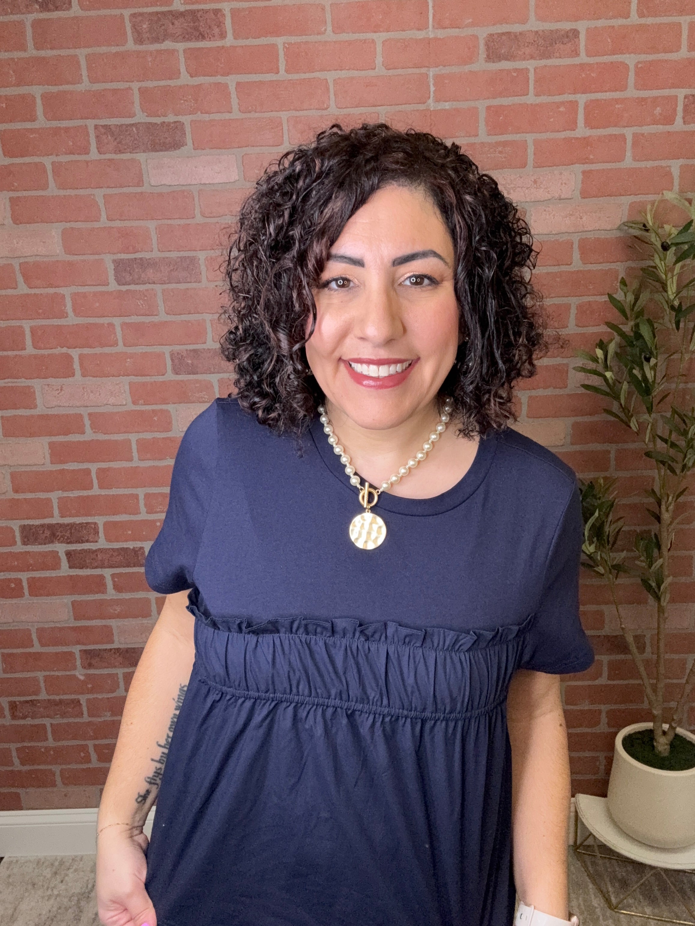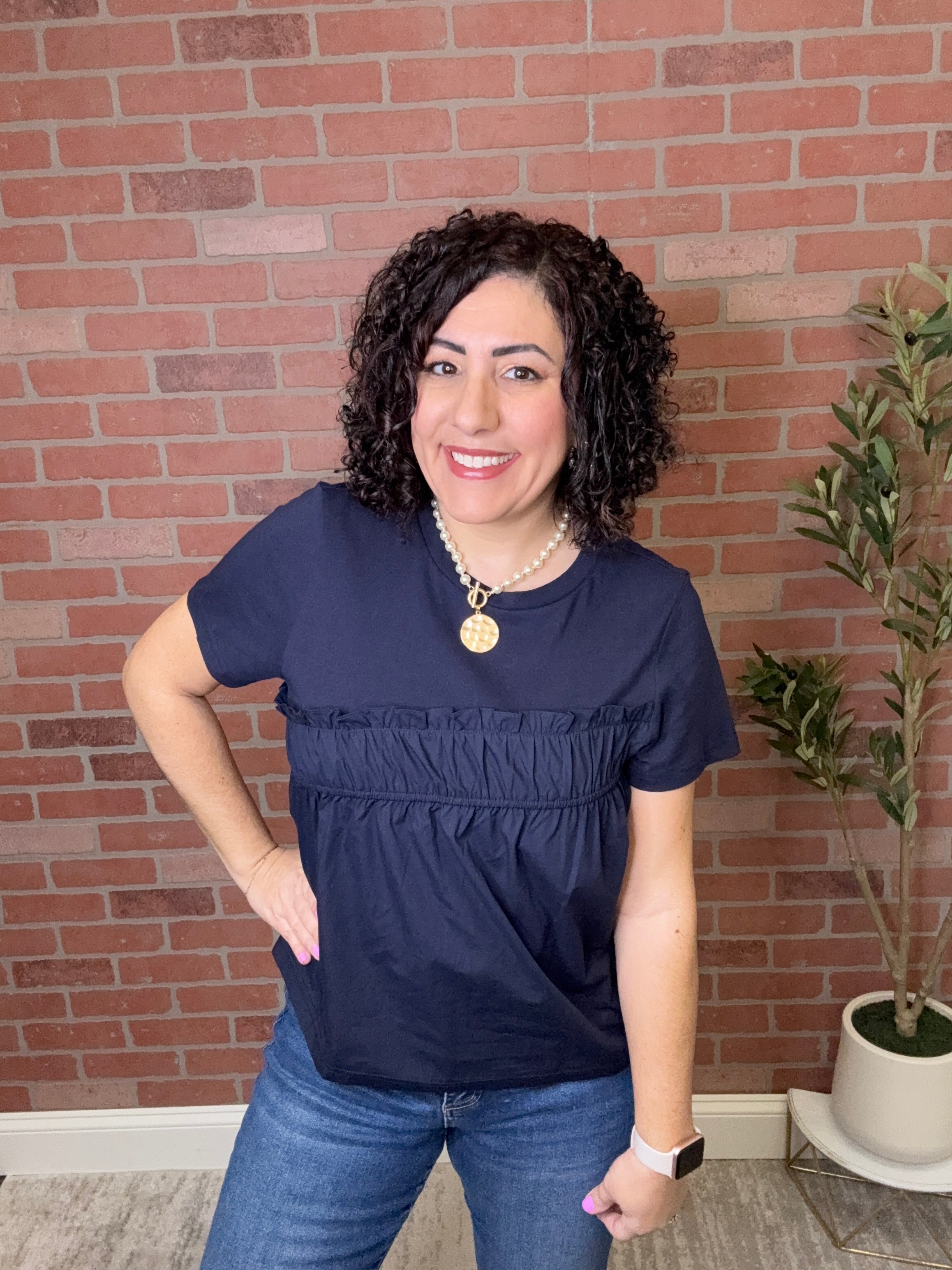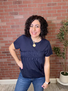 Crafted in a rich navy hue, this versatile top pairs perfectly with denim, skirts, or tailored shorts for an elevated everyday look. Whether styled casually or dressed up with statement accessories, it’s a chic staple for any wardrobe.