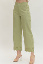 Solid woven ankle-length pants featuring scallop eyelet hem. Zip-fly button front closure. Front and back pockets. Unlined. Woven. Non-sheer. Lightweight