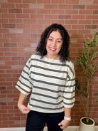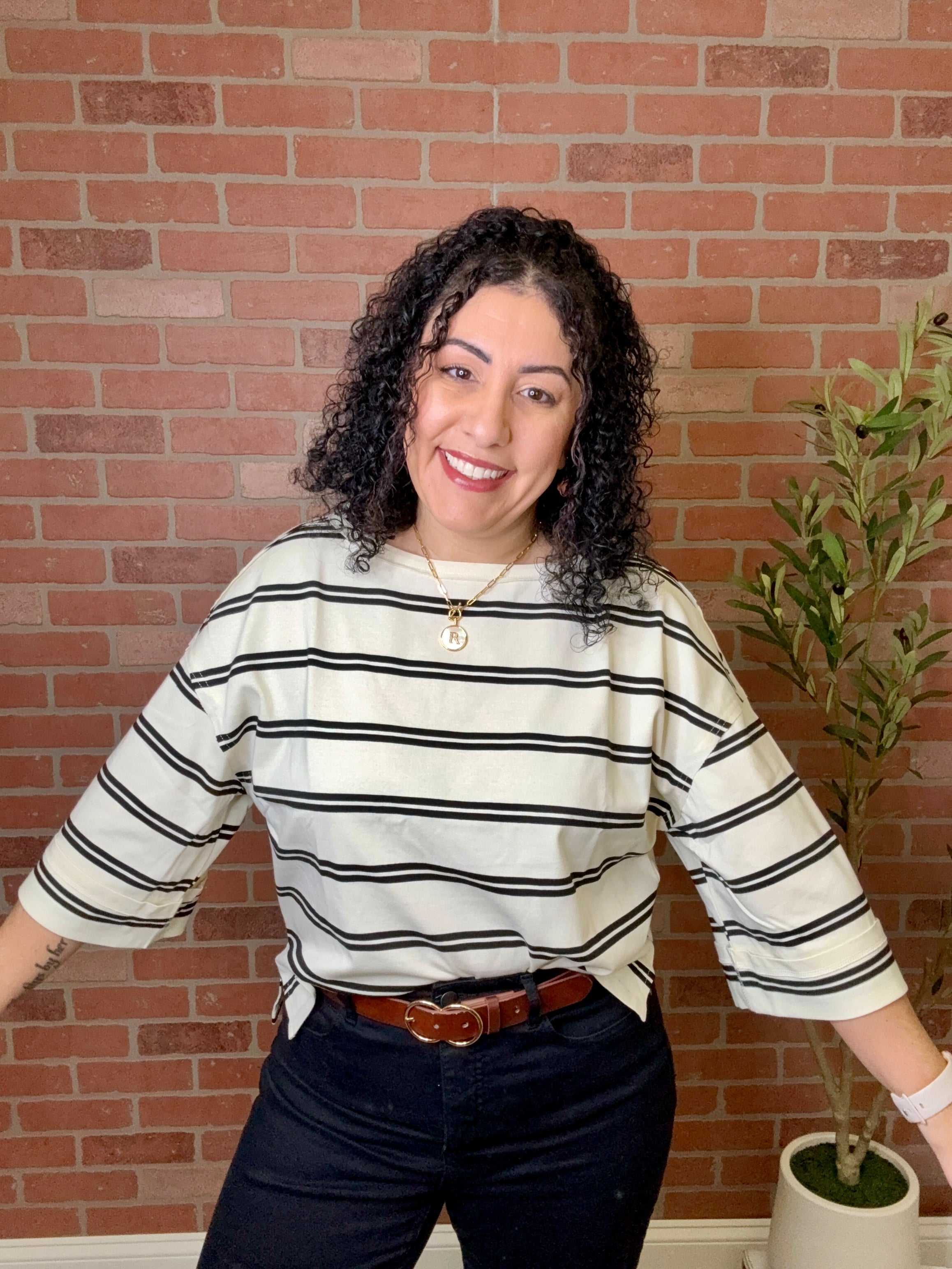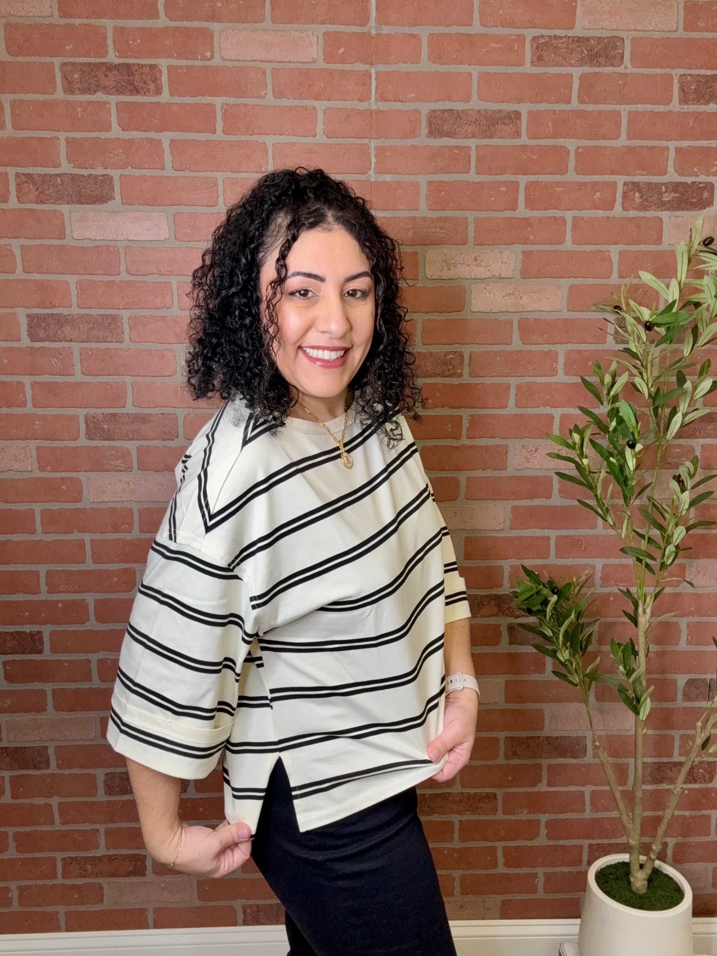 Effortless style meets comfort in this oversized striped tee. The relaxed fit and classic stripe pattern make it a versatile wardrobe staple that pairs seamlessly with jeans, skirts, or layered pieces. Crafted for everyday wear, this tee delivers a laid-back look that works for casual outings or weekend lounging. Perfect for building a timeless collection of basics.