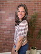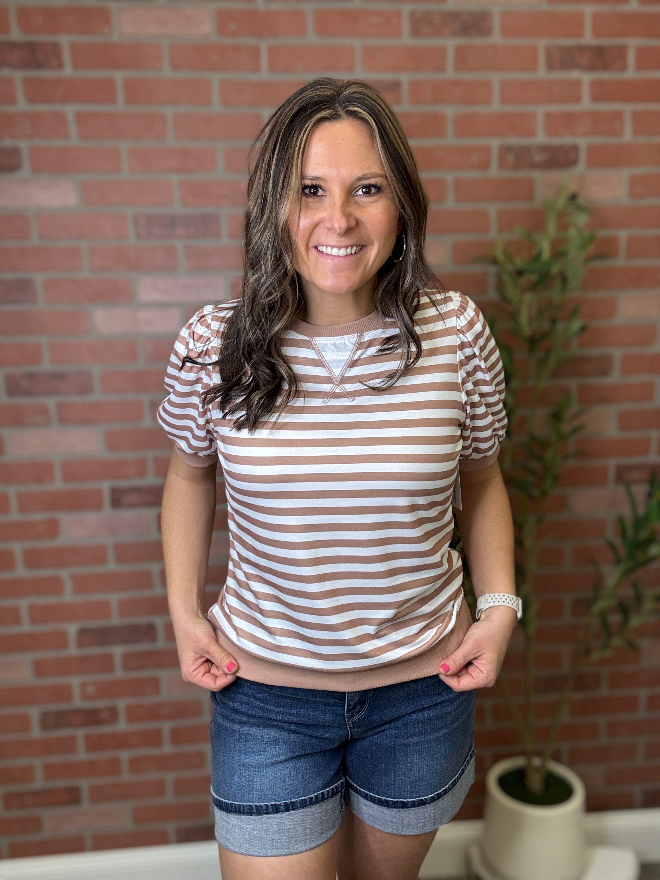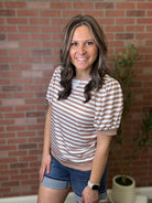Add a touch of effortless charm to your everyday style with our Casual Beige & White Striped Puff Sleeve Top — a perfect blend of comfort, softness, and modern femininity. Whether you're meeting friends for brunch or enjoying a relaxed weekend, this striped top keeps your look polished and cozy.