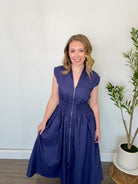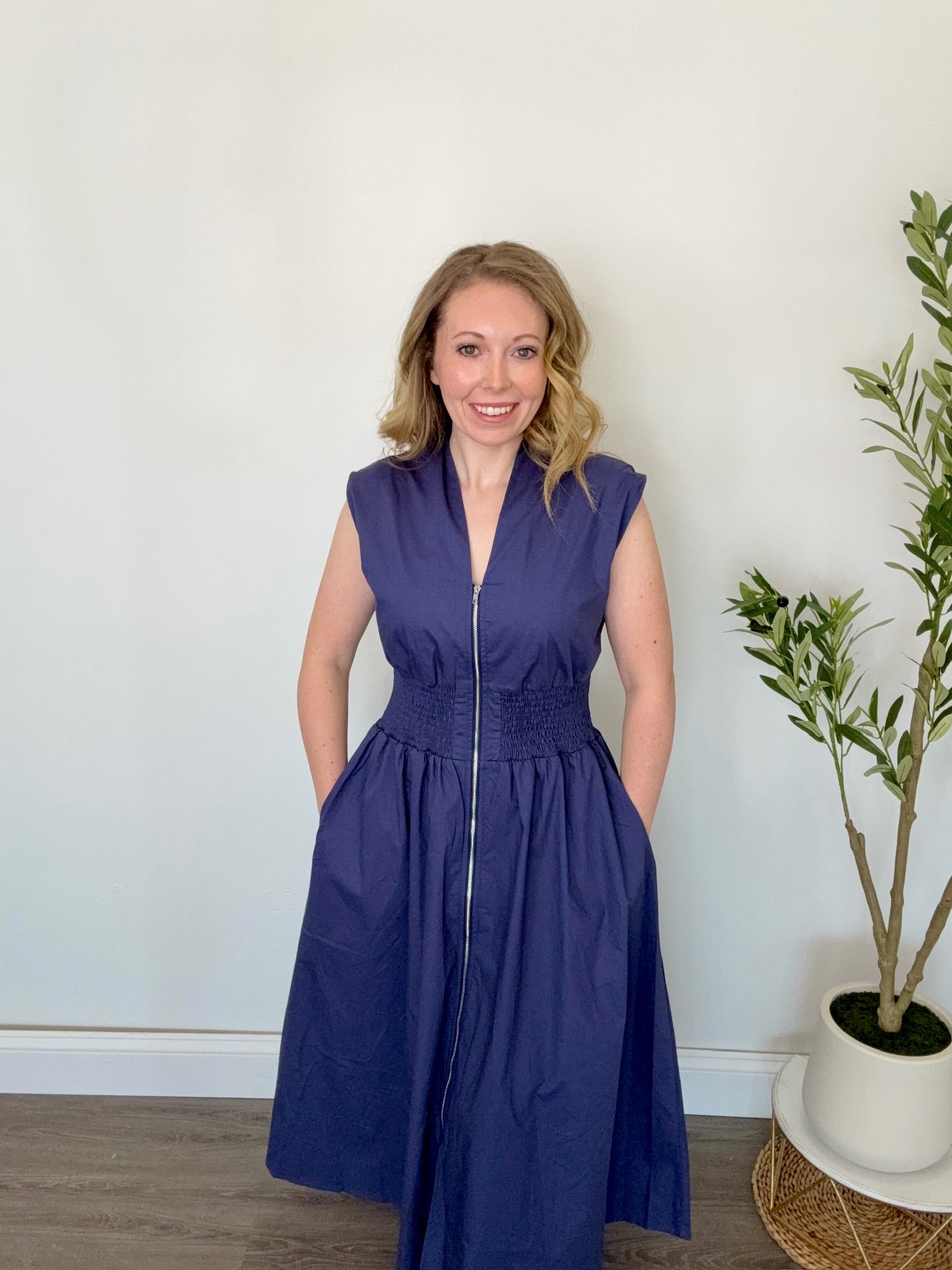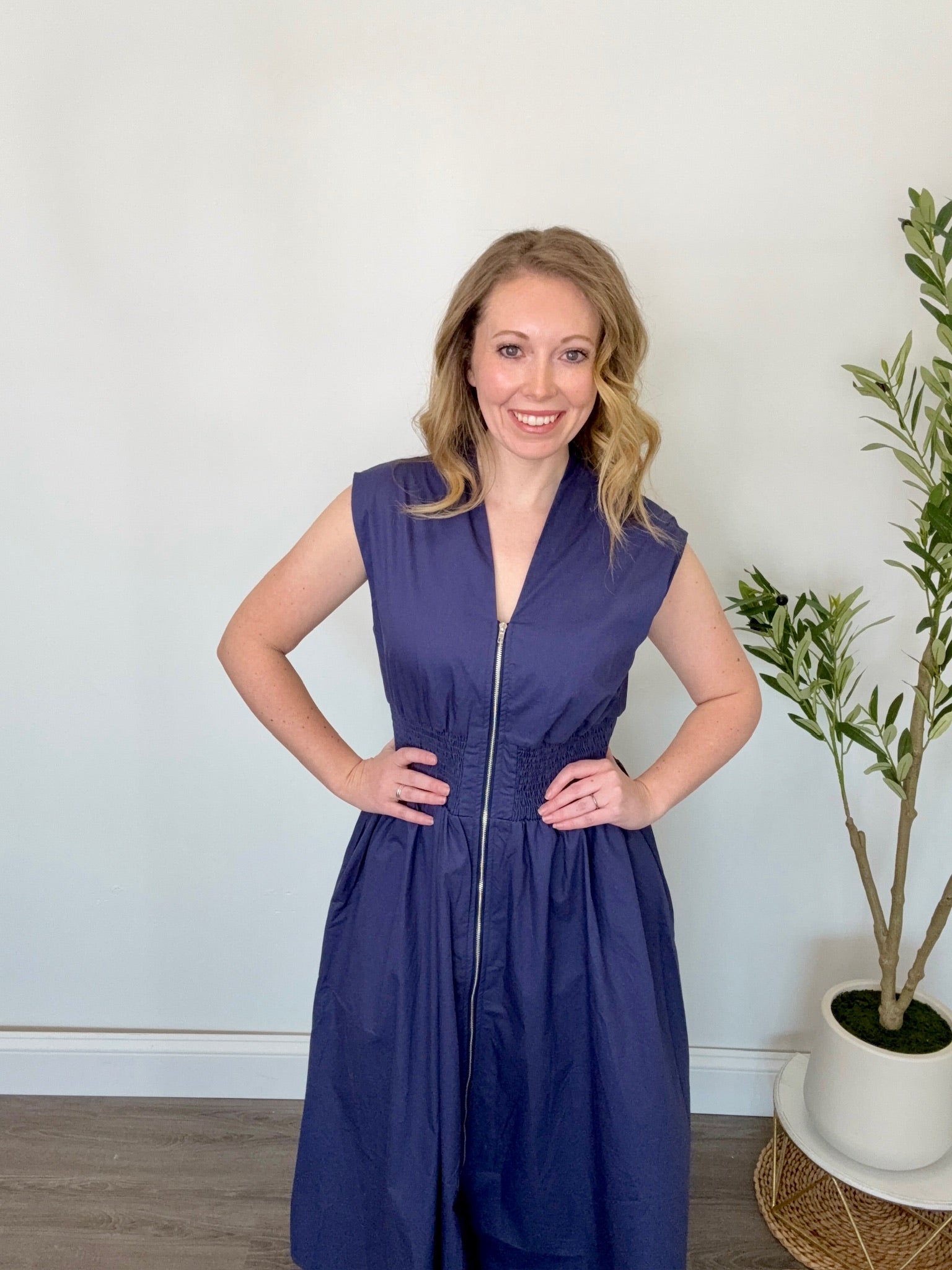 DROP SHOULDER SMOCKED WAIST MIDI DRESS WITH FRONT ZIPPER AND POCKETS