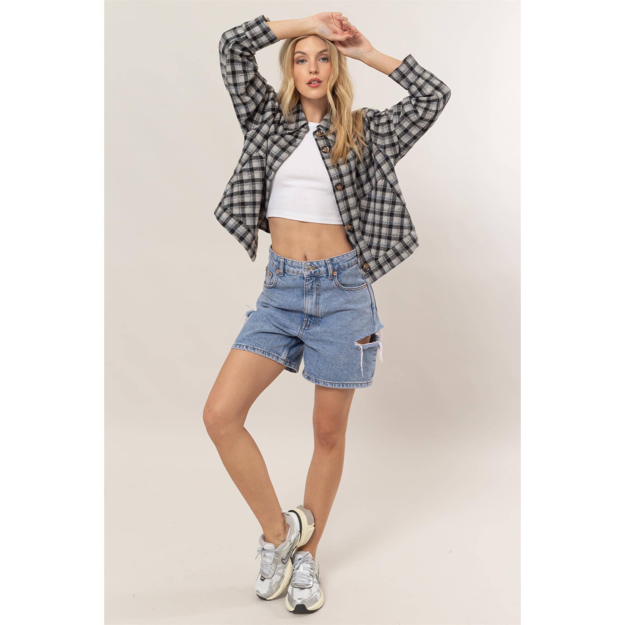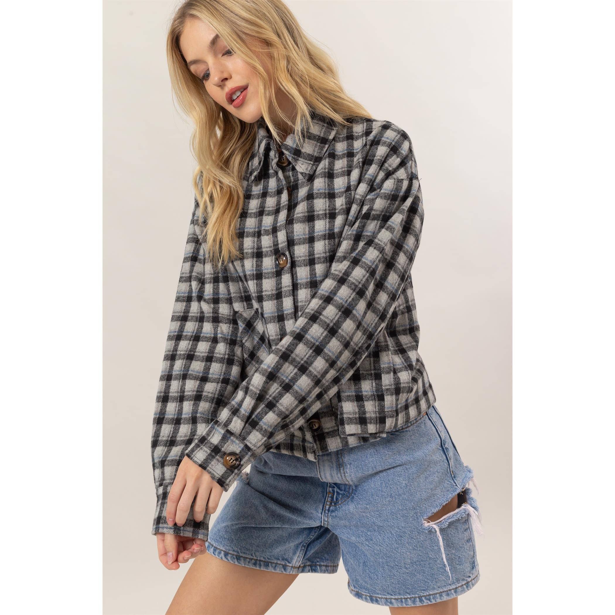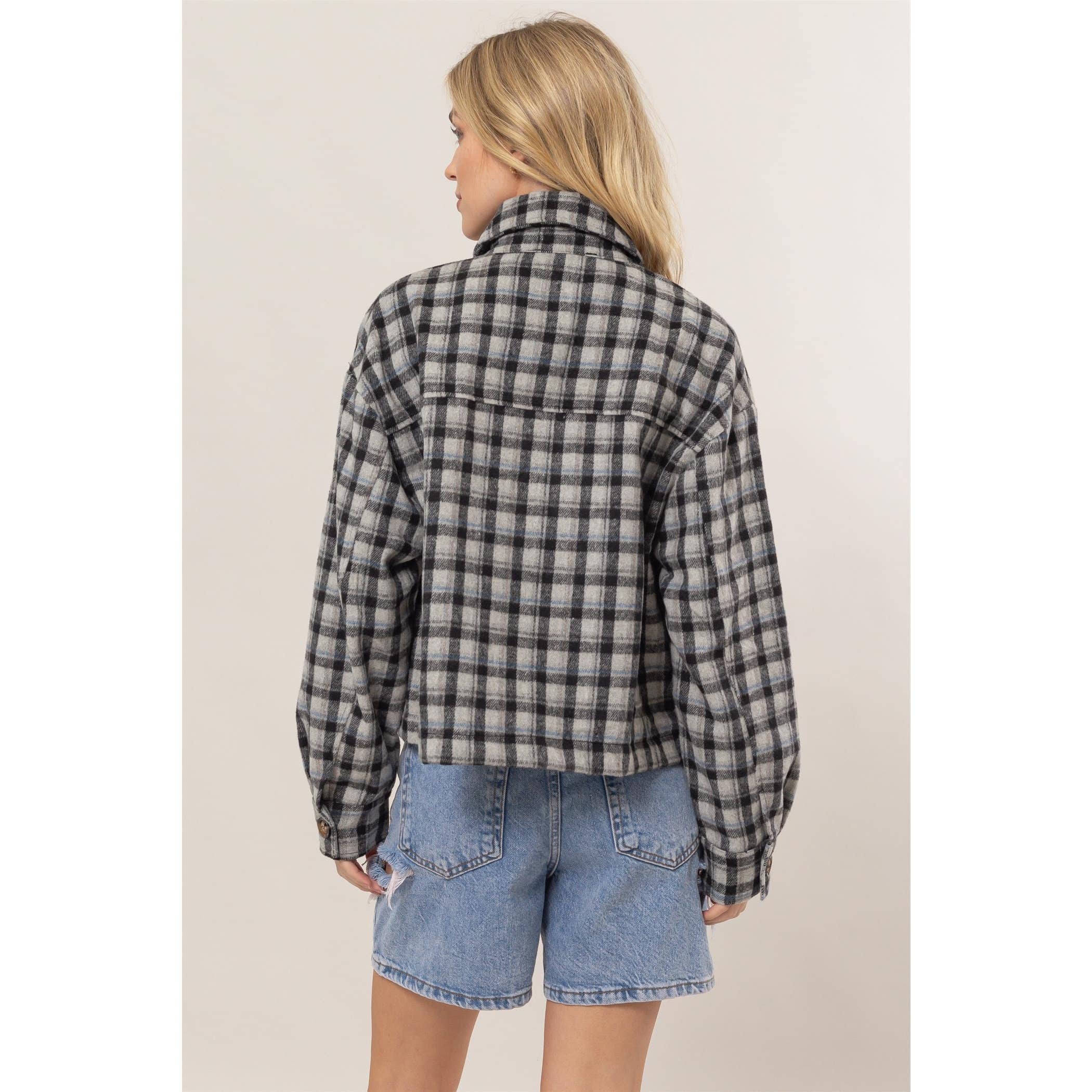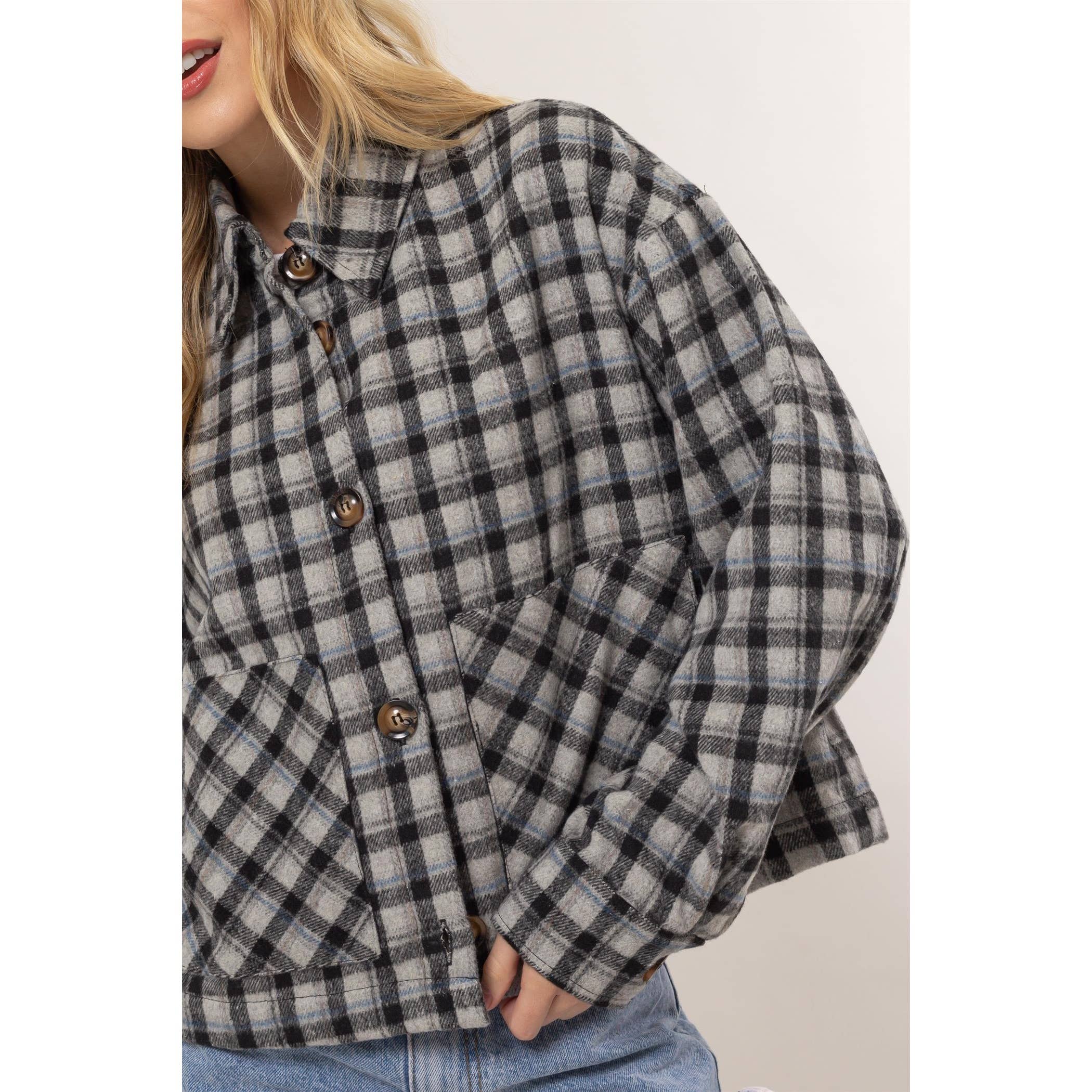 This modern jacket has an allover plaid pattern adds a timeless touch to this jacket that's tailored with a point collar, drop shoulders and long sleeves. The relaxed bodice has patch pockets and a button placket down the front.