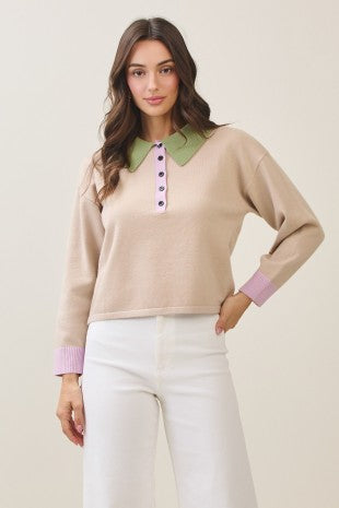 Elevate your everyday look with this effortlessly chic colorblock knit top. Designed with a soft neutral base and contrast details, this piece features a structured collar, button-front neckline, and subtle pops of color at the collar and cuffs for a modern, polished finish. The relaxed silhouette makes it easy to dress up or down, while the lightweight knit keeps it comfortable all day long.