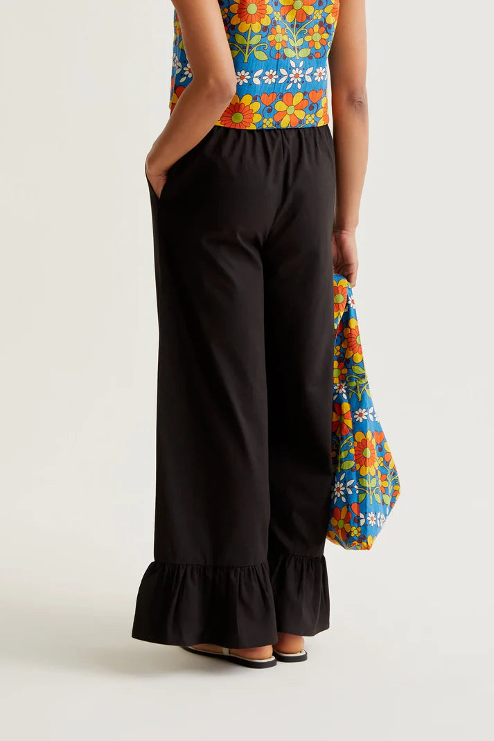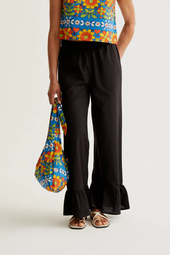 Add flare to your wardrobe with these 100% cotton ruffle hem trousers. These versatile bottoms feature an elastic waist, side pockets and a flirty ruffle hem.