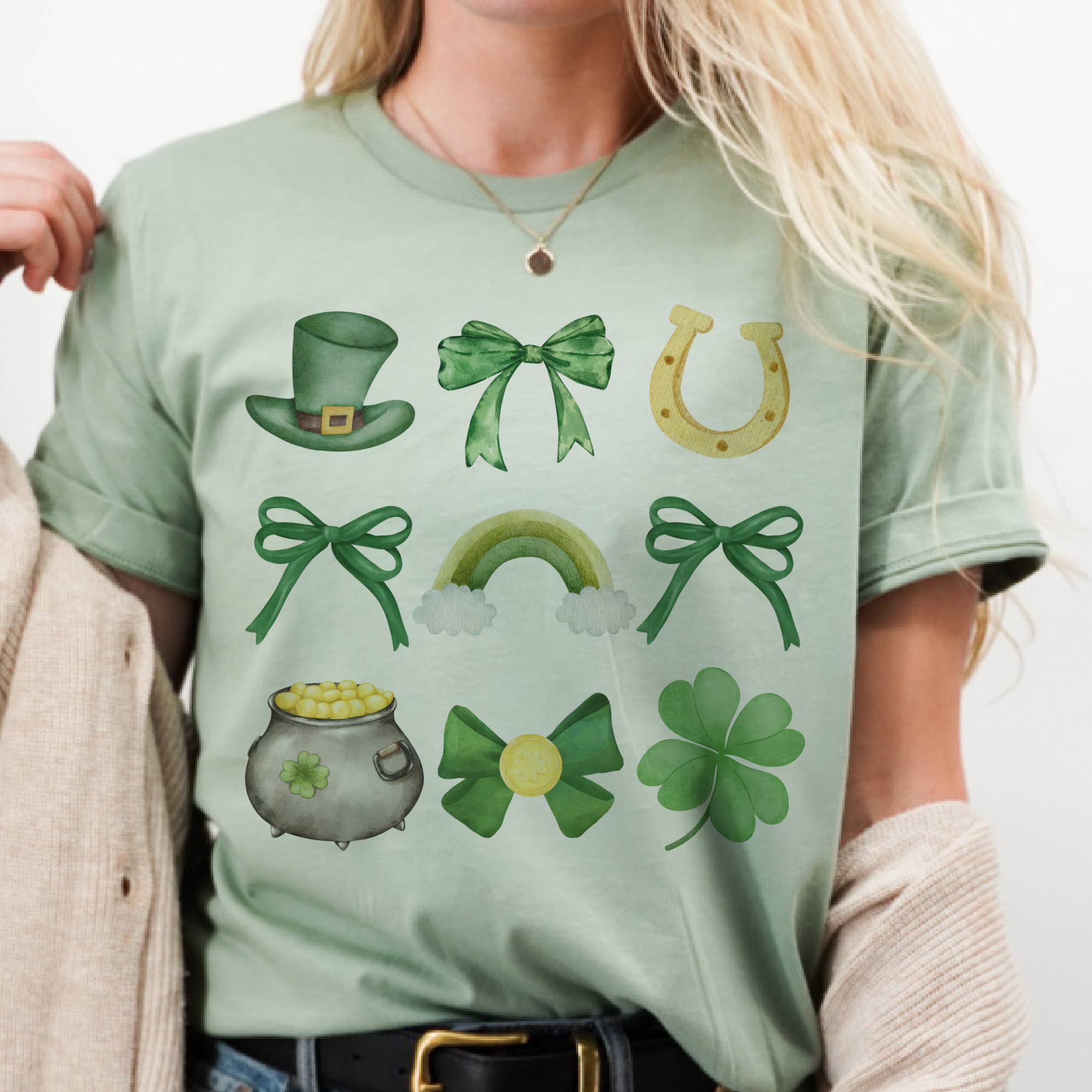 Celebrate the luck of the Irish with our St. Patrick's Day Clover and Shamrock Collage Tee! Festive Collage Design: Features a playful mix of clovers, shamrocks, and other St. Patrick's Day motifs in vibrant green tones.