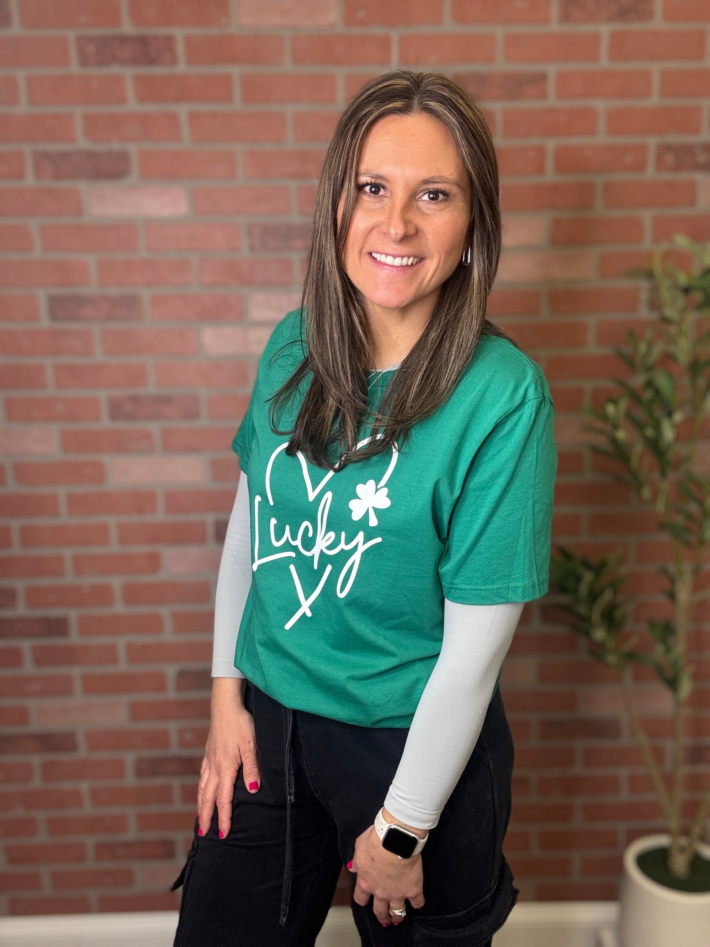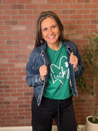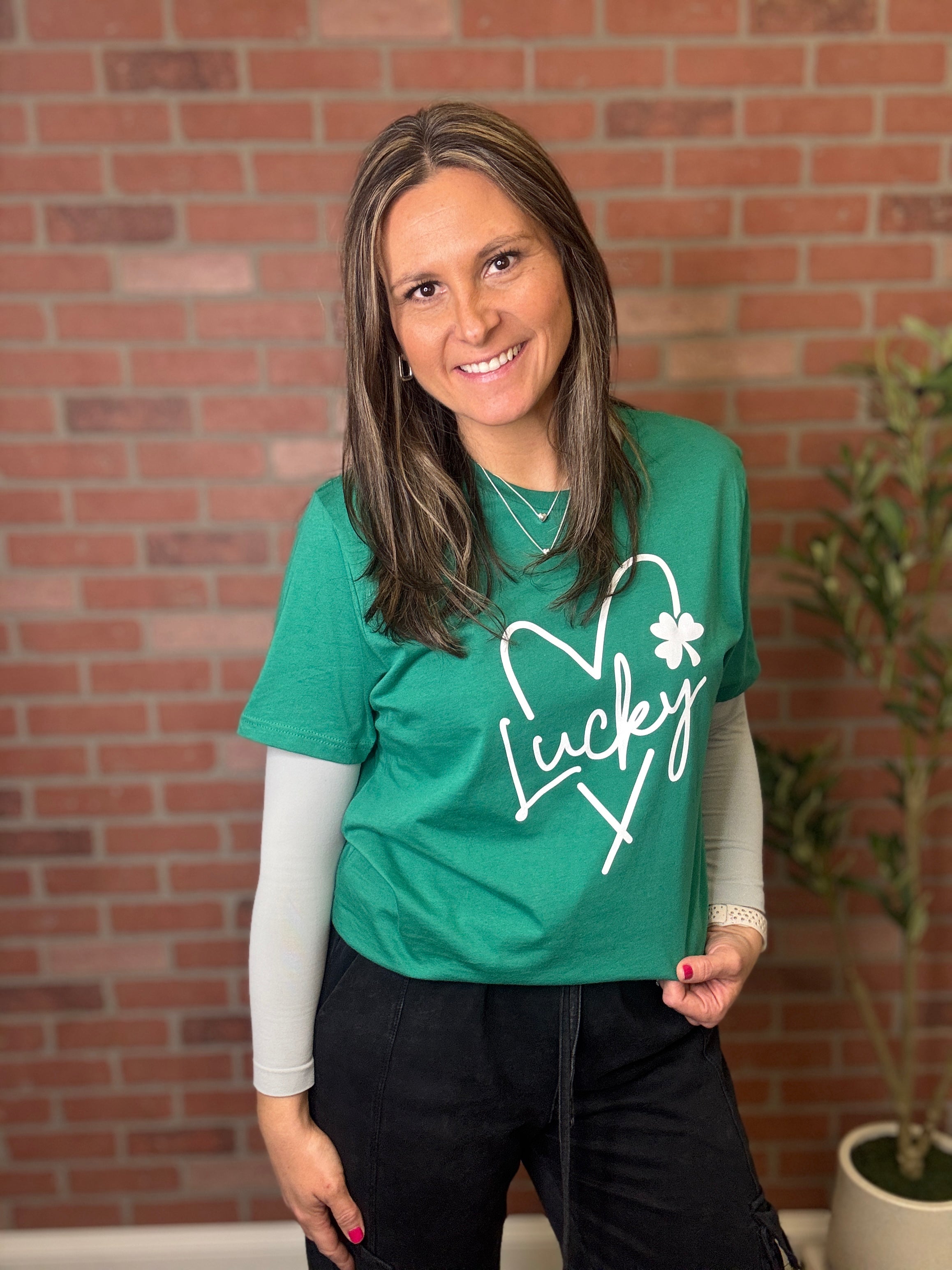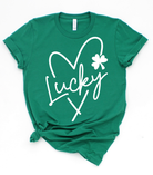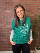 Embrace the Irish spirit with our St. Patrick's 'Lucky' Heart Tee. A charming nod to the season of luck and love, perfect for celebrating St. Patrick's Day with style.