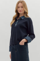 Solid wide contrast cuff long sleeve collar button closure top. Unlined. Knit. Non-sheer. Lightweight.