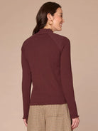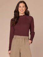 This mixed media knit top is endlessly versatile, with long sleeves, a mock neck, seaming detail, and a straight hem. Wear it on its own for an easily polished look or style it under a layer with the chic lettuce edge details popping through