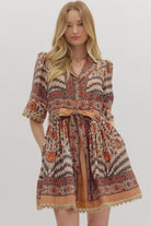 Botanical print short puff sleeve mini dress featuring contrast trim, button front closure and elasticated back waist. Removable self belt. Lace trim accents at sleeve and hem. Side pockets. Lined.