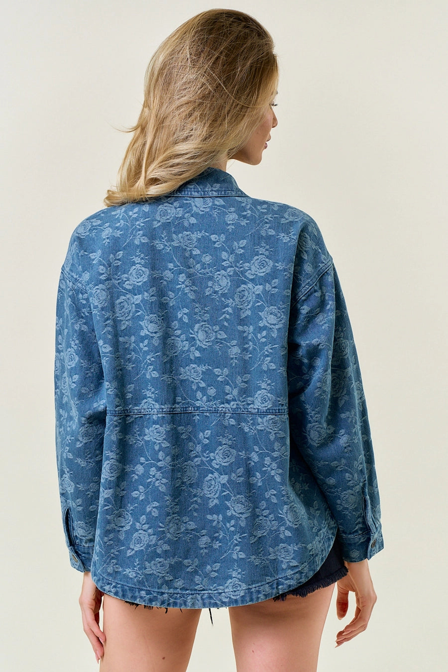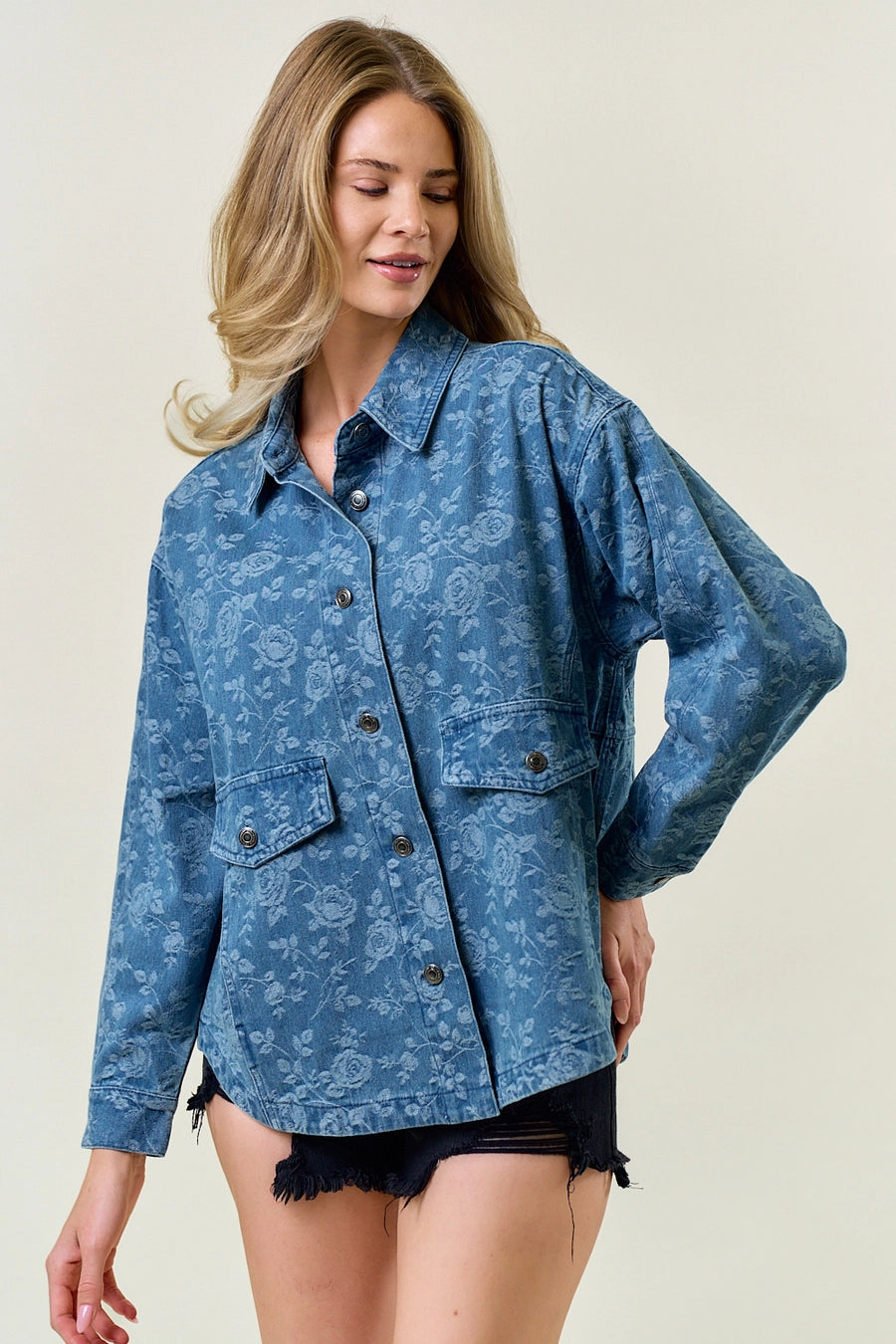 Features a unique metallic chintz floral pattern for a stylish, modern twist on classic denim relaxed, oversized fit for comfortable layering - Classic shirt collar and button-down front closure - Front flap pocket with button detail for added functionality