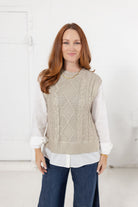 Elevate your fall style with this chic sweater vest. The foiled finish adds a subtle shine, while the classic cable knit brings texture and elegance. With its fooler layered effect at the sleeves and hem, it creates a stylish, layered look effortlessly with your favorite bottoms