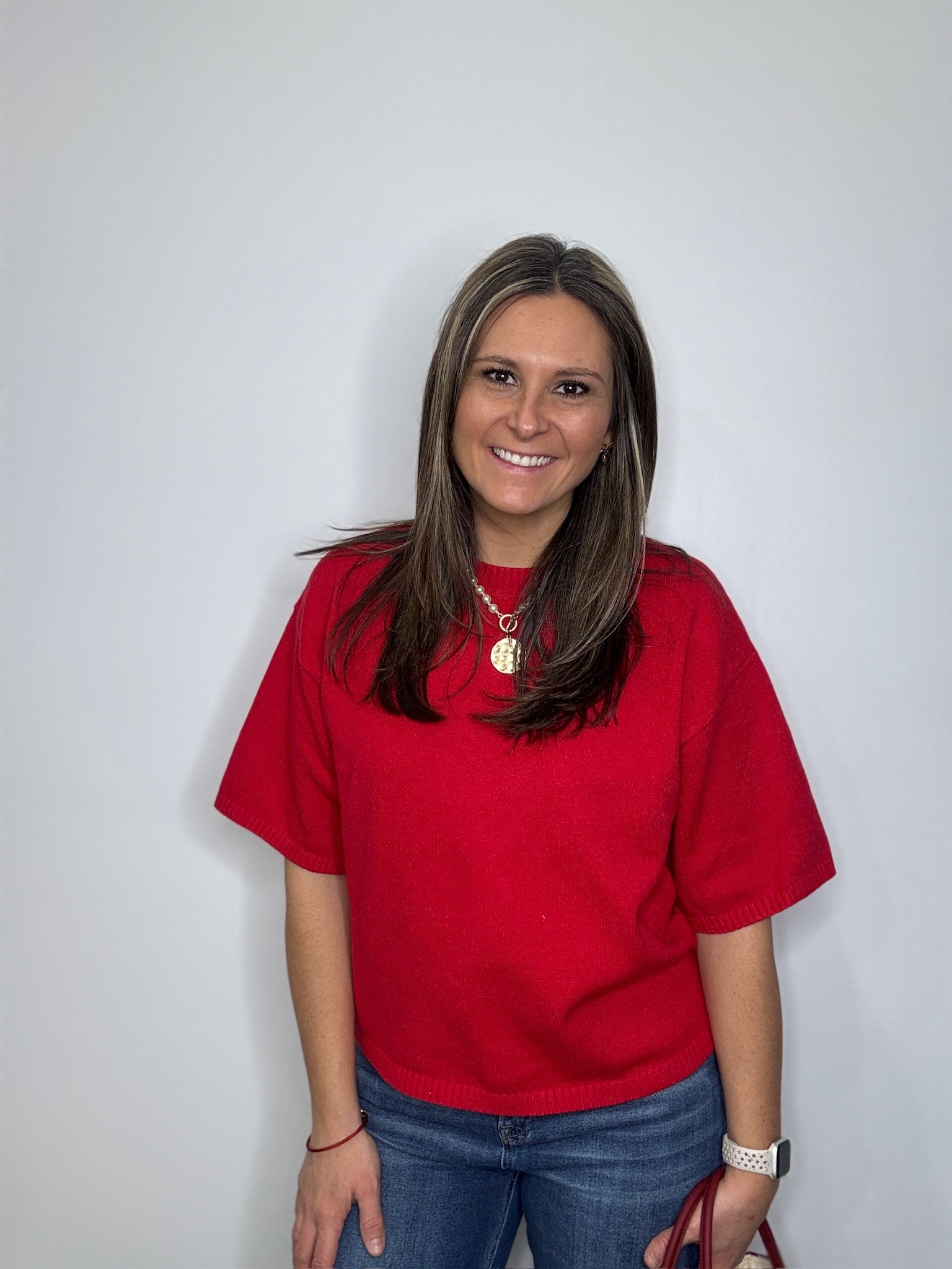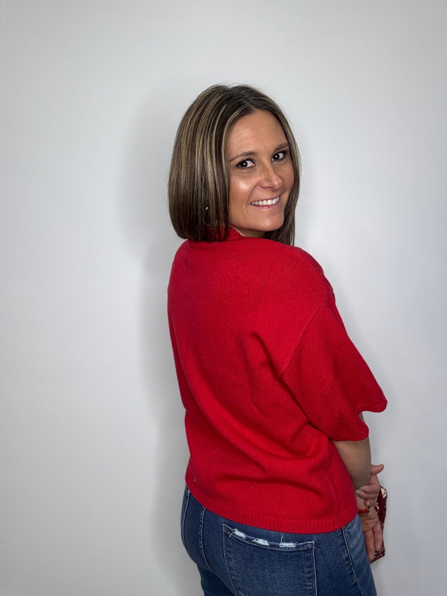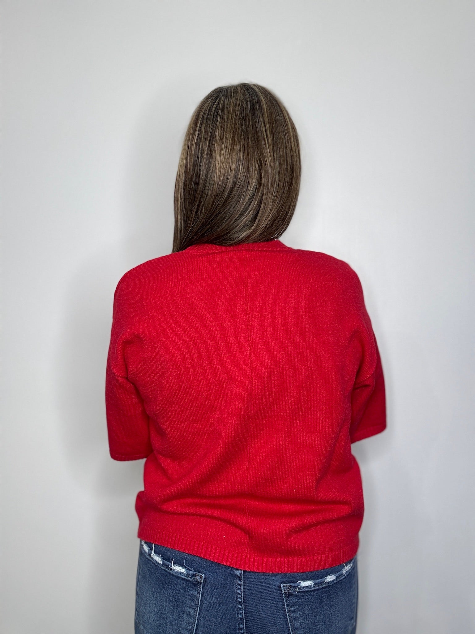 A cozy short sleeve sweater top with a relaxed silhouette, ribbed crew neckline, and soft knit texture. Perfect for layering or wearing on its own, this versatile top pairs effortlessly with jeans, skirts, or trousers for a casual yet polished look.