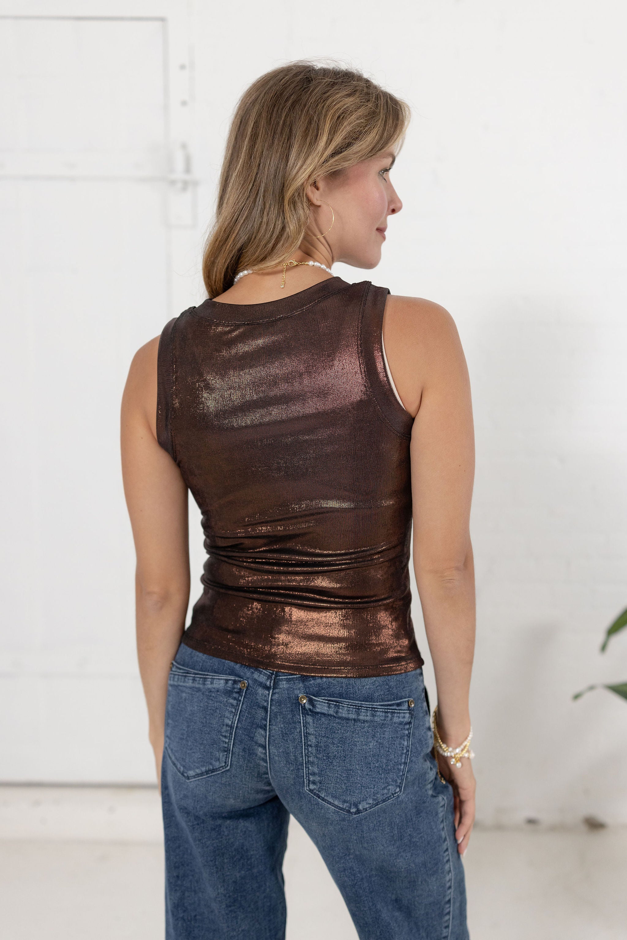 The Glitter Wash Racerback Tank is your go-to for instant sparkle. Designed with a sleek, fitted silhouette and a modern high neckline, this tank hugs you in all the right places while the allover glitter finish adds just the right amount of shimmer. The racerback cut keeps it sporty-chic — perfect for layering or letting it shine solo.