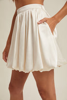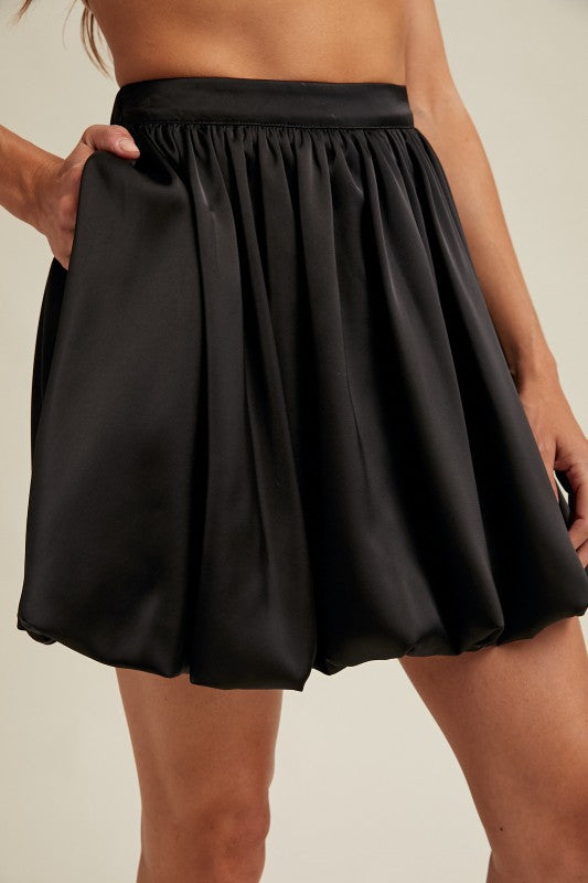 Lined satin bubble skirt with zip closure elastic back waistband and side pockets.