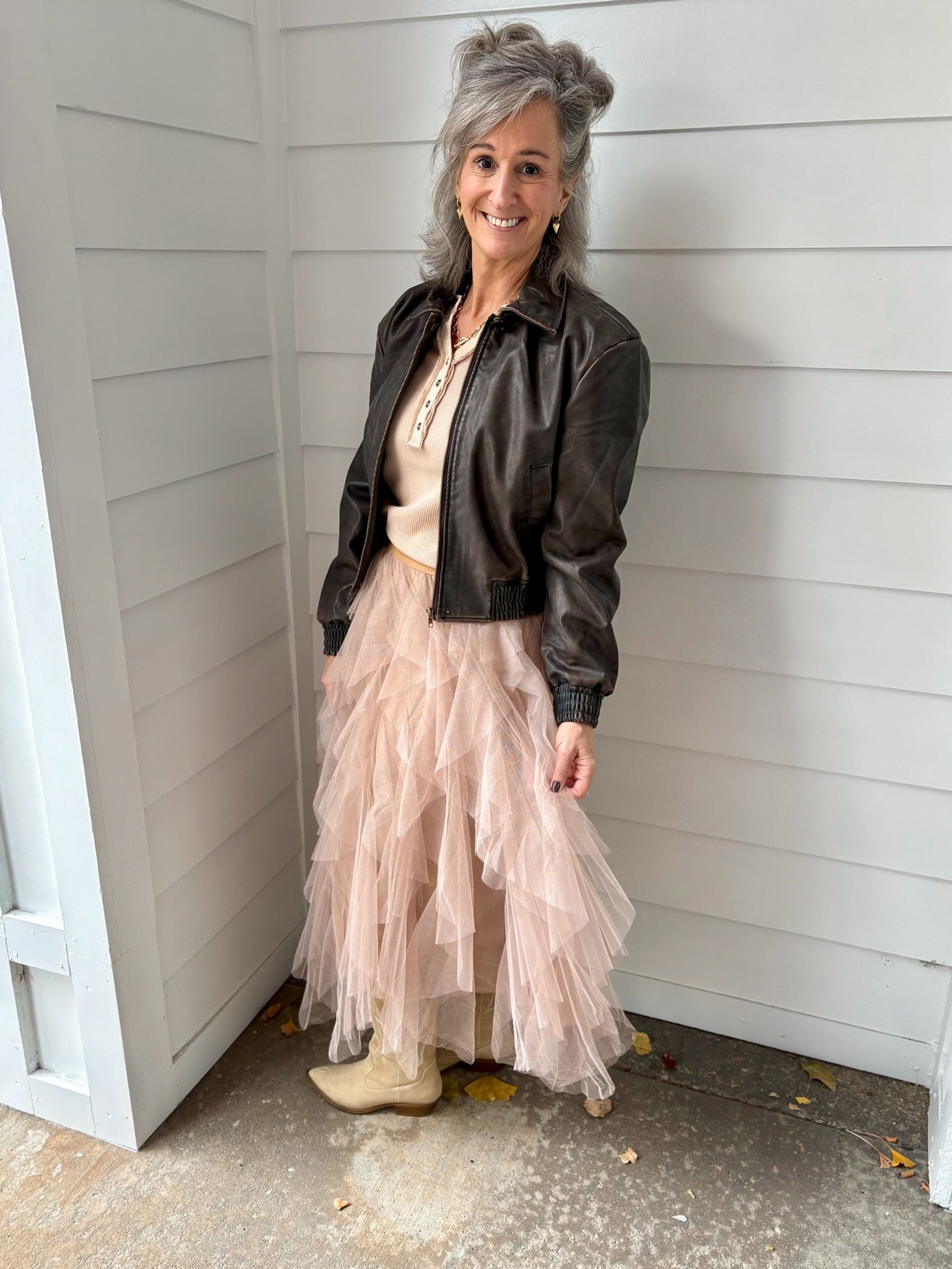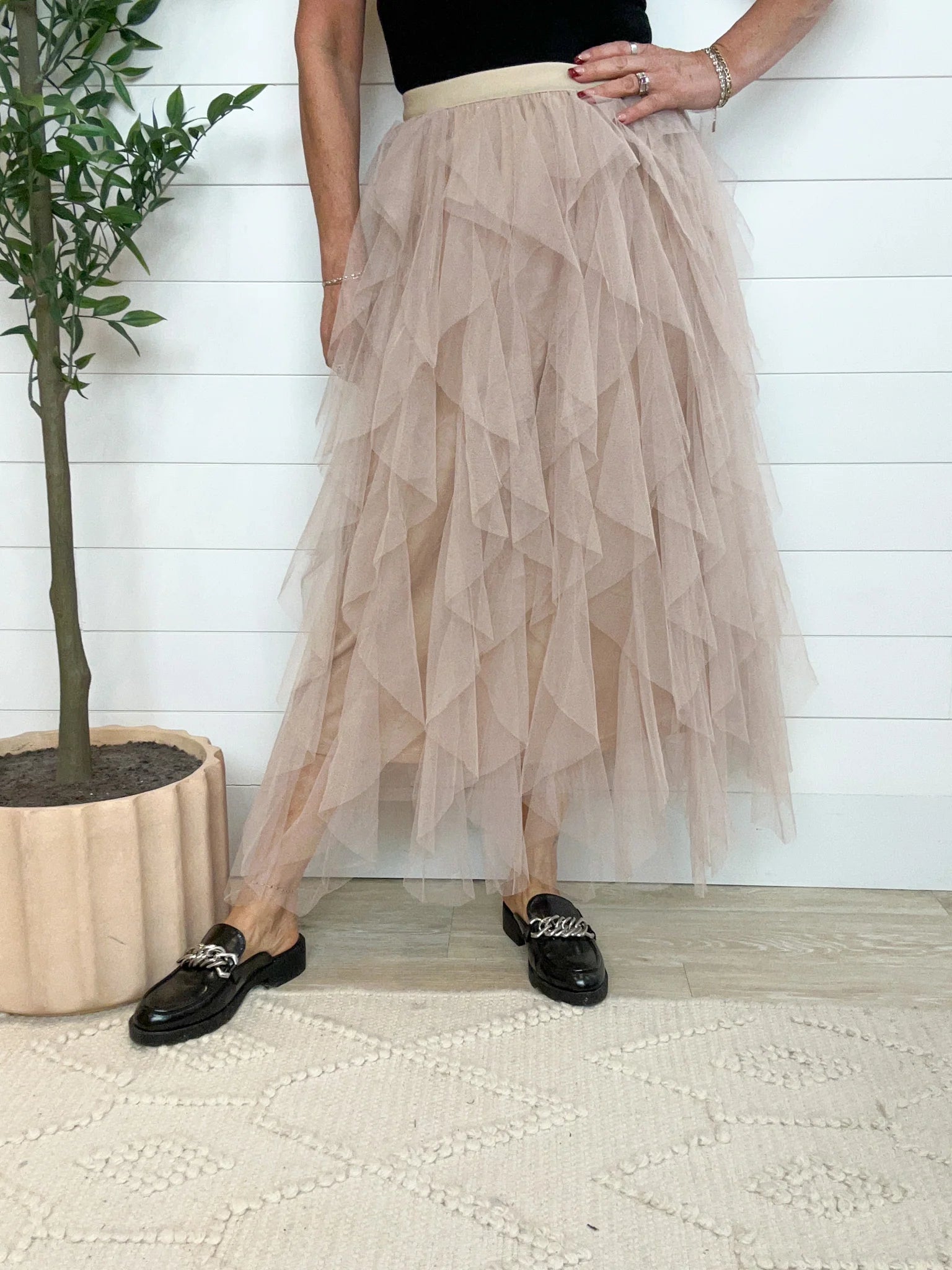 Romantic, feminine, and effortlessly twirl-worthy — our Tiered Tulle Maxi Skirt is a statement piece that brings a touch of whimsy to any outfit. Layers of soft, cascading tulle create beautiful movement and volume without feeling heavy. The neutral blush tone makes it easy to pair with everything from a casual sweater or leather jacket to a sleek blouse for dressier occasions. Finished with a comfortable elastic waistband for an easy, flattering fit.