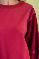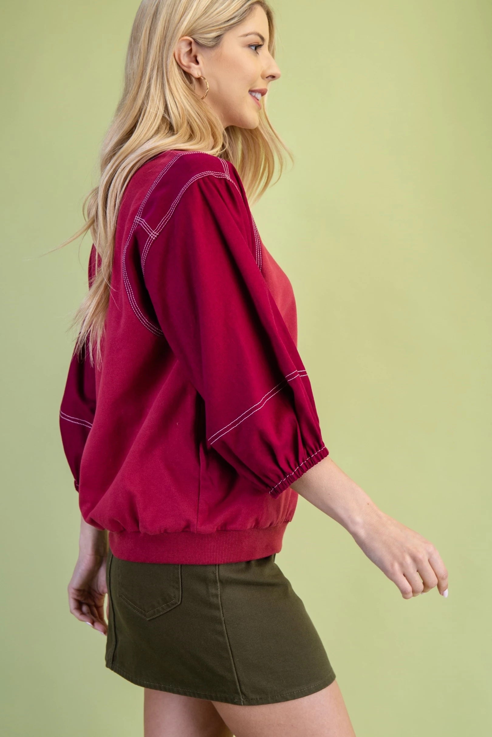 Mixed Fabric Top with 3/4 Length Sleeves and Contrast Stitching