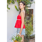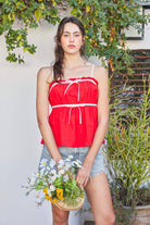 Babydoll tank top blouse with elastic at the back and contrast bow detailing and adjustable spaghetti straps.