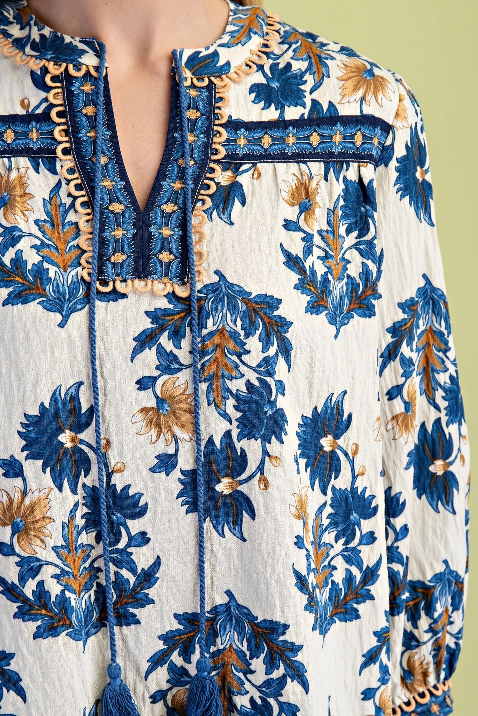 Floral Fall Print 3/4 Length Sleeve Blouse with Decorative Trim Details and a Tassel Neck Tie
