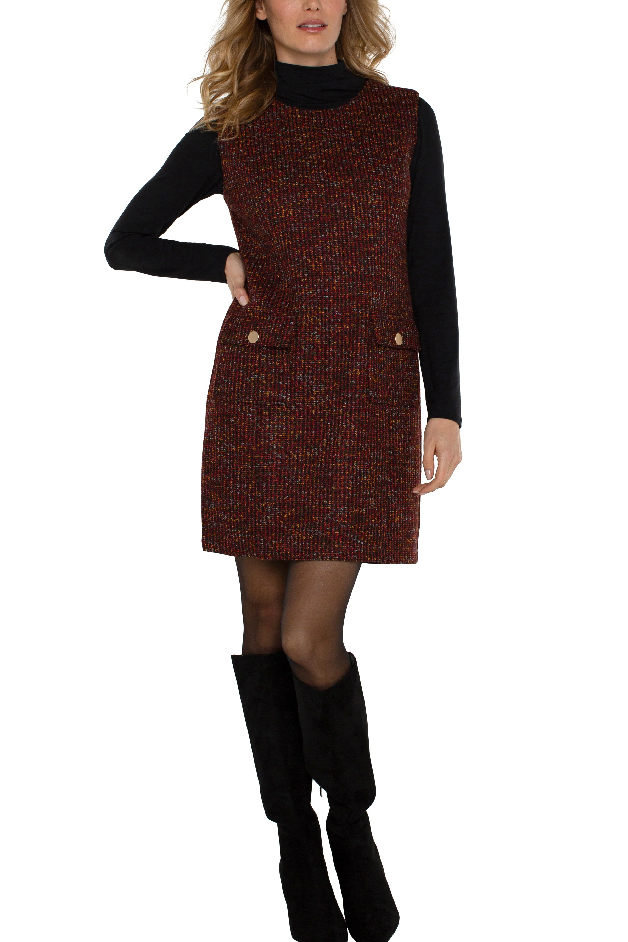 Crafted from a luxurious Bordeaux multi-fabric blend, this dress boasts a richly soft texture and a dynamic interplay of hues that adds depth and dimension to your ensemble. The sleeveless silhouette offers a modern twist on a classic design. With a discreet back zipper that lets you to slip into this dress with effortless grace. Whether paired with knee high boots for a sophisticated evening look or dressed down with flats for a more relaxed vibe, this dress exudes elegance and timeless allure. 36" Center front length. Semi fitted. Sleeveless. Two front pockets with functional buttons. Back zipper. Boucle knit. Polyester.
