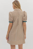 Stripe pattern short puff sleeve swing shirt dress with accented multicolor rib band. Collar button closure. Lined.