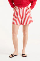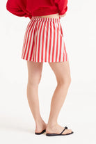 Cotton poplin shorts with red striped print. With fixed front waist and mid-rise elastic at the back. Side pockets.