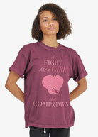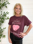 This special tee was designed for breast cancer awareness, and how strong and courageous those are who battle or have battled breast cancer. In a plum color way of our famous boyfriend tee, it’s a powerful message whether or not you have been impacted by breast cancer.