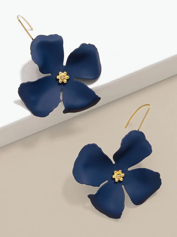 Delicate threader, pull-through earring with a hand-painted metallic, 4-petal flower drop. Accented with 18k gold-plating.