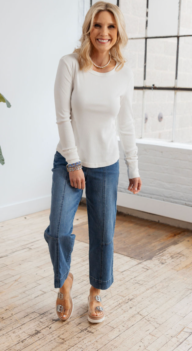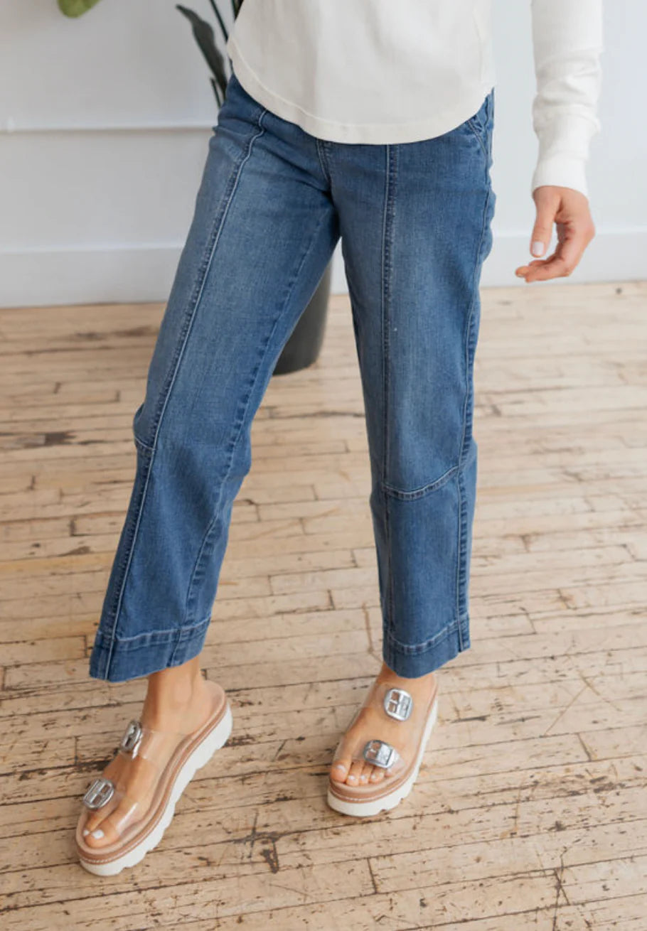 Step into effortless style with these modern denim pants. Featuring a 27" inseam, 18" leg opening, and a flattering 11" rise, this pair offers a comfortable and contemporary fit. The standout front seam details add a touch of sophistication and elongate the silhouette, while the classic medium wash makes them versatile for any wardrobe. Perfect for casual days or elevated looks, these jeans are designed to be both stylish and functional. A must-have for those seeking unique yet timeless denim!