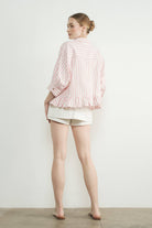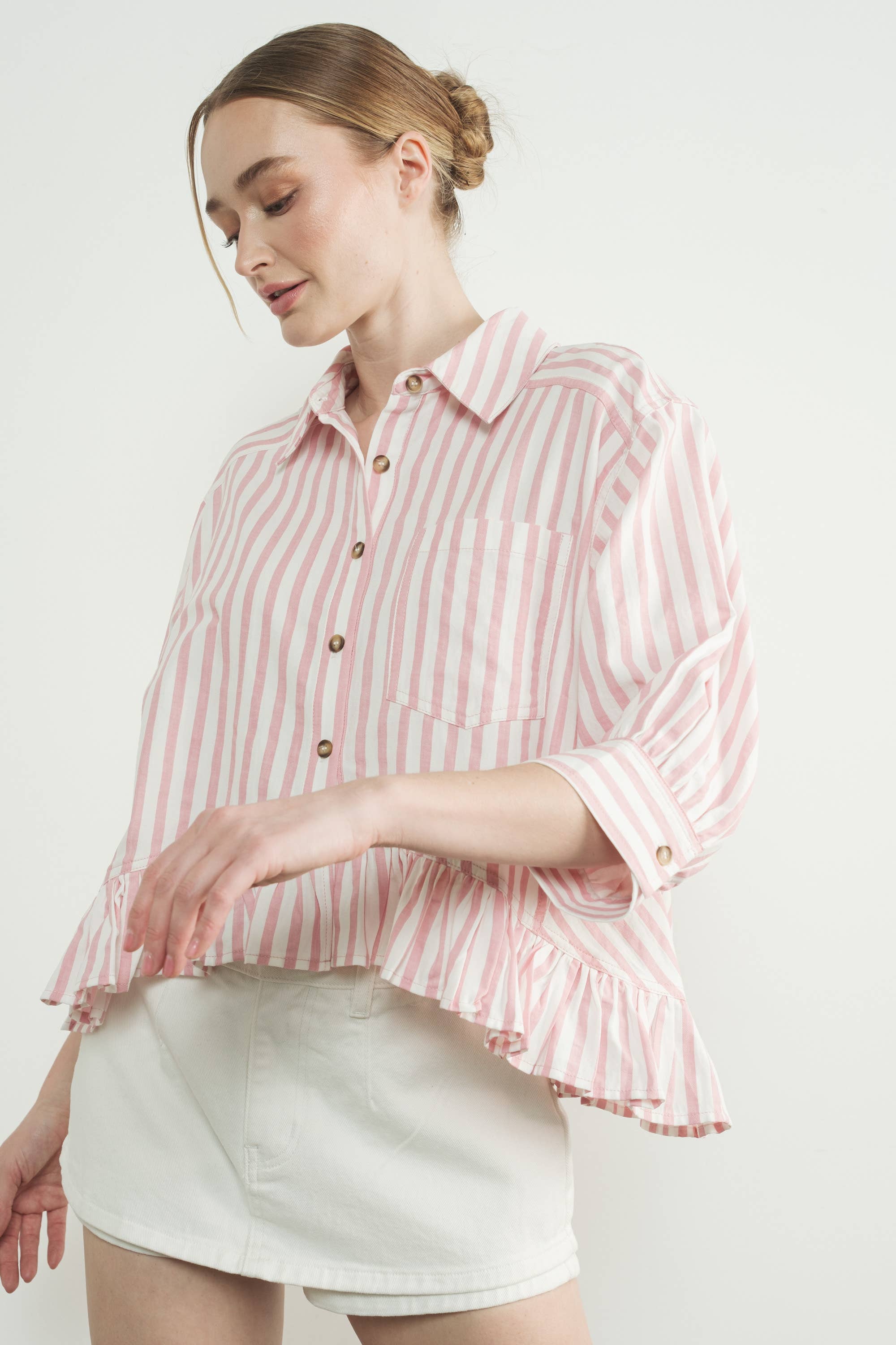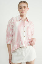 This shirt is perfect blend of classic and feminine charm! The striped fabrication and collared neckline give it timeless appeal, while the ruffle hem and 3/4 sleeves add a playful, delicate touch. The relaxed fit and hip-length cut offer comfort without compromising on style. Its cool, summery colors make it ideal for warm-weather outings.