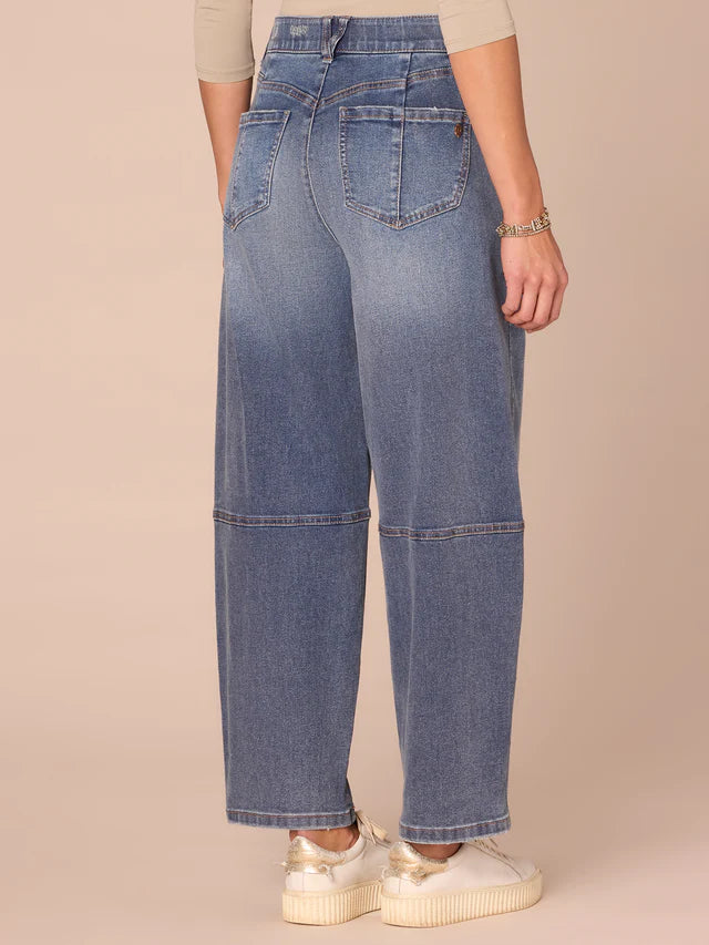 The relaxed Barrel Leg is slightly fitted at the hips, with a looser, relaxed fit from the thighs to the hemline. Crafted in a mid blue artisanal wash and engineered with "Ab"solution® fit technology to smooth, support, and enhance your shape—giving you everything from a flatter tummy to a perkier rear view.