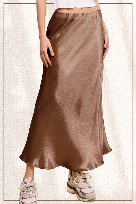 This satin long skirt, with its glossy, silky finish, reflects light beautifully. It has a fluid, draping silhouette that falls elegantly to a midi length, enhancing its chic and sophisticated appeal. The skirt features a smooth, elasticized waistband for a comfortable fit and a slightly flared hem for effortless movement. Its lustrous fabric adds a touch of glamour, making it perfect for both casual and dressy occasions