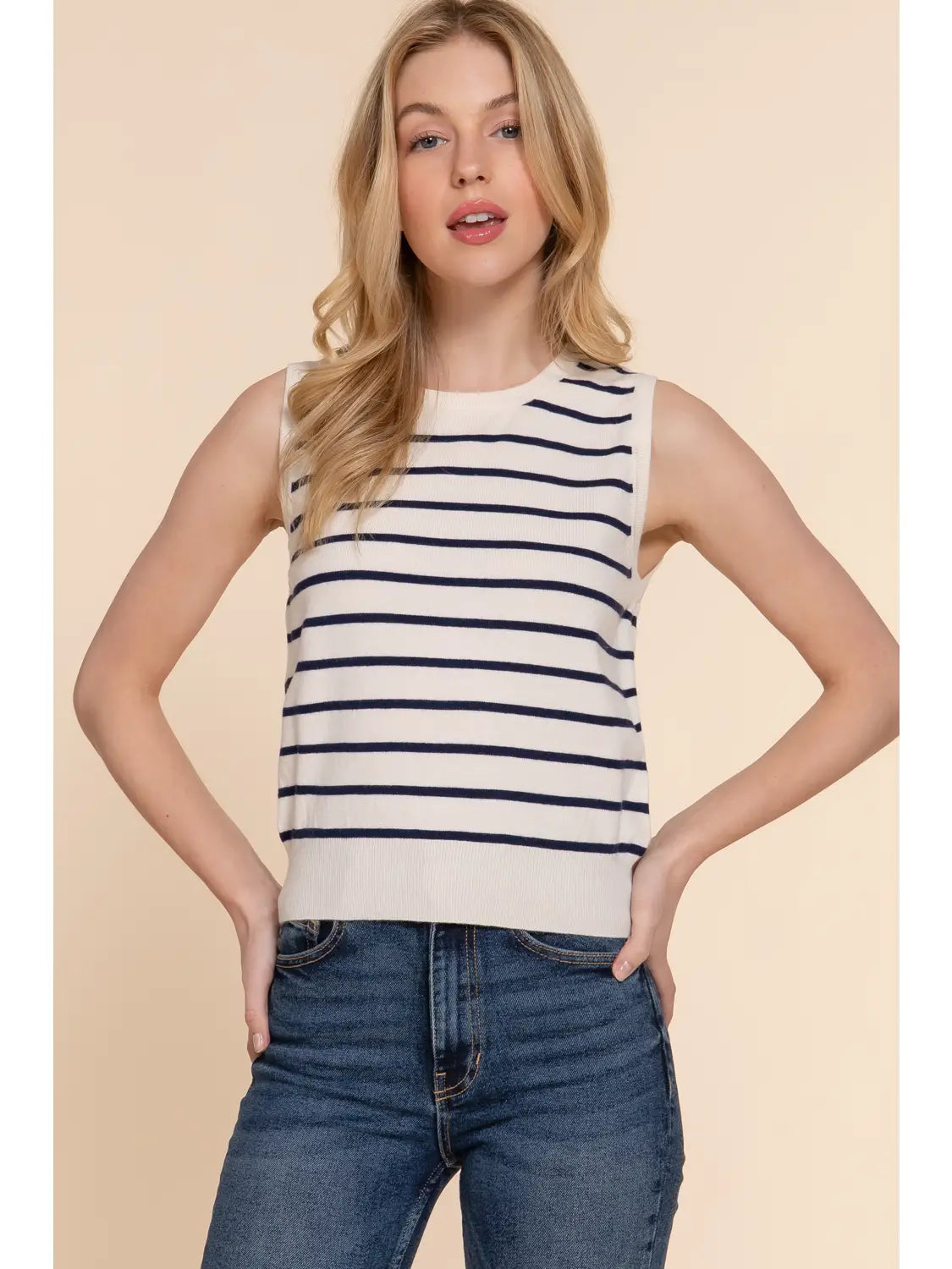 A timeless essential with a nautical twist — this navy and white striped sleeveless sweater tank brings classic style to your warm-weather wardrobe. Featuring a crew neckline, soft knit texture, and a clean, slightly cropped hem, this top is perfect for layering or wearing on its own. Pair it with high-rise denim, linen trousers, or a flowy skirt for an effortlessly polished look that transitions from day to night.