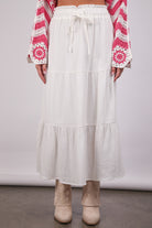 Breezy, beautiful, and effortlessly versatile — this white tiered maxi skirt is a warm-weather must-have. Made from a lightweight, crinkle-textured cotton blend, it features a comfortable elastic waistband with an adjustable drawstring tie for the perfect fit. The tiered silhouette creates a soft, flowy shape that moves with you, making it easy to dress up or down. Pair it with a tank, crochet top, or chambray blouse for the ultimate boho-chic vibe.