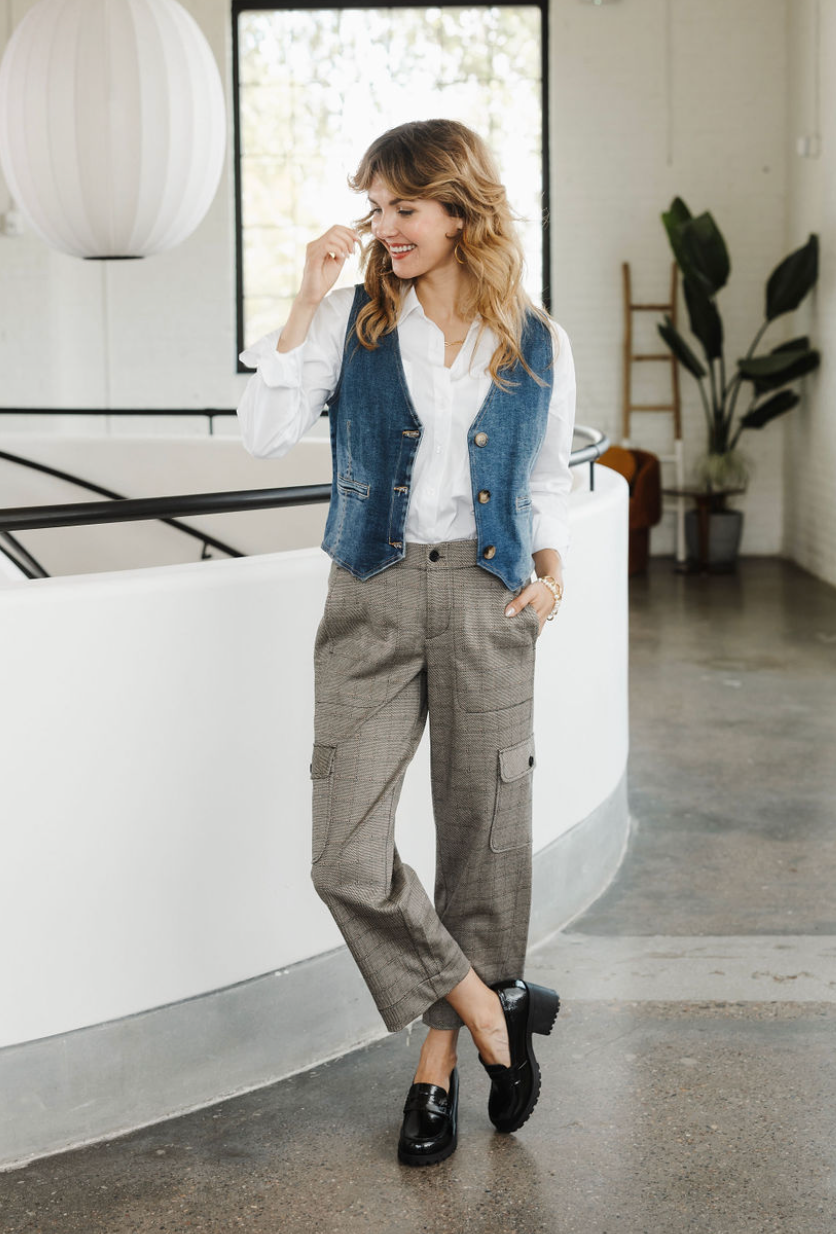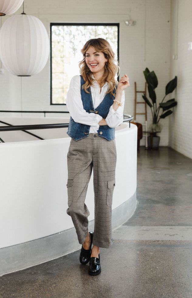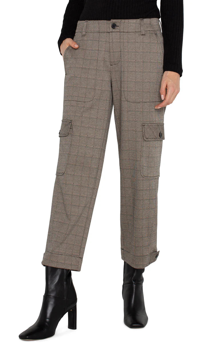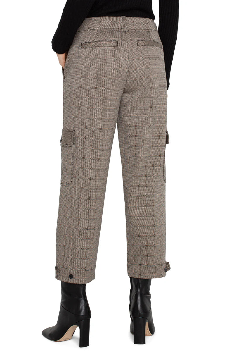 Our Utility Crop cargo pant is designed in a Plaid Jacquard Knit for ultimate comfort and style. These pants prove that utility can be versatile and elevated featuring cargo pockets and an adjustable tab hem. Throw on a tee and jacket for a weekend out on the town! 26" INS. Mid-rise. Cropped. Side flap pockets. Front porkchop pockets. Back welt pockets. Tab hem. Plaid jacquard knit. Polyester, Rayon, Nylon, Spandex.